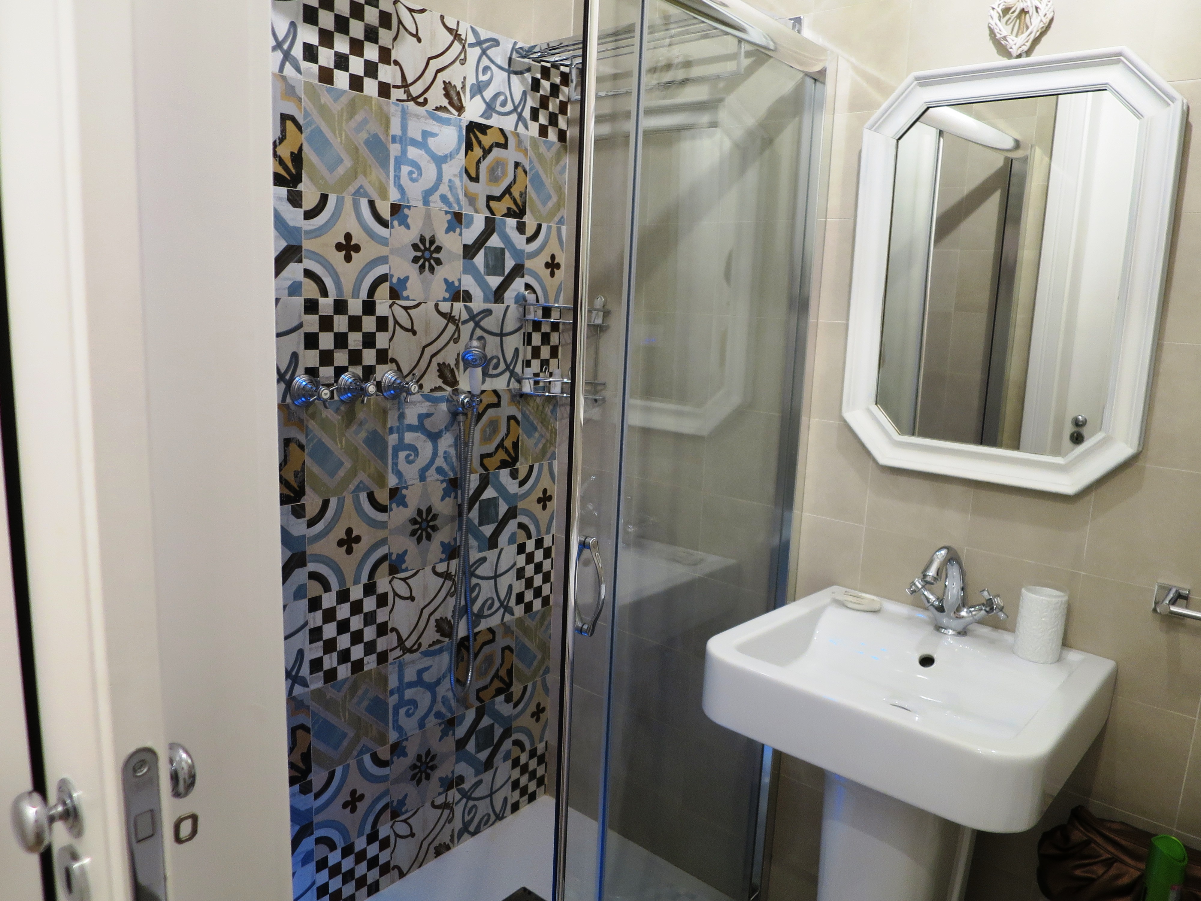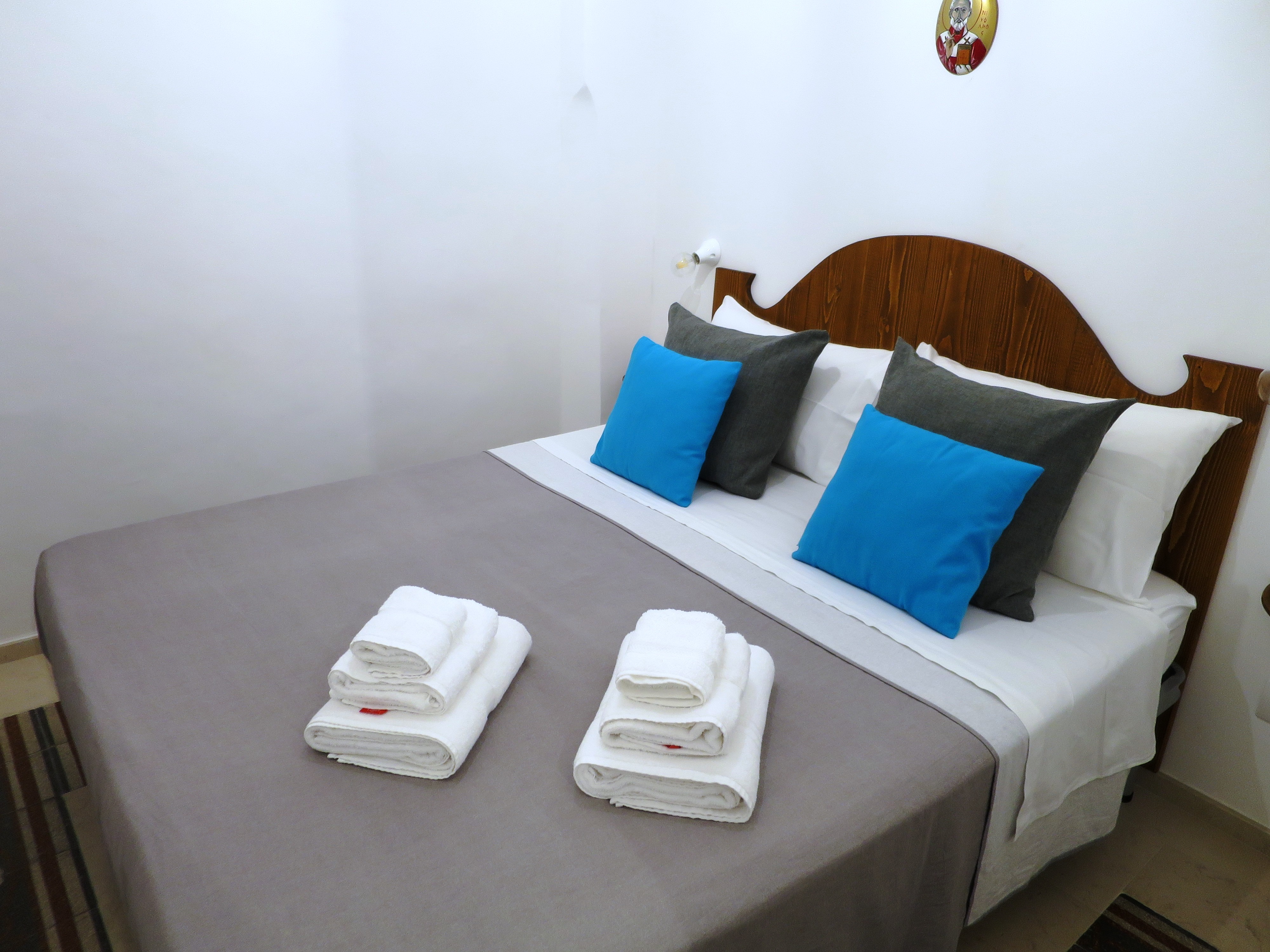 Sichtlich stolz schloss er die mehrfach verriegelte Tür auf und liess uns in das wohltuend kühle Haus eintreten. Wow! Das schmale Hotel mit nur 2 Zimmern im ersten und zweiten Stock ist liebevoll restauriert. Alte, sehenswerte Fliesen oder z.B. Decken und Mauern wurden teilweise erhalten. Trotzdem hat das Haus jeden modernen Komfort. Im Eingangsbereich im Parterre befand sich eine Küchenzeile und die Frühstücksecke. Links ging eine sehr steile Treppe in den ersten Stock, wo sich unser Zimmer befand. Eigentlich hatte sogar jede von uns ihr „eigenes Zimmer“. Nachdem man eingetreten war, hatte man die Badezimmertüre vor sich und jeweils links und rechts einen separaten Schlafraum.
