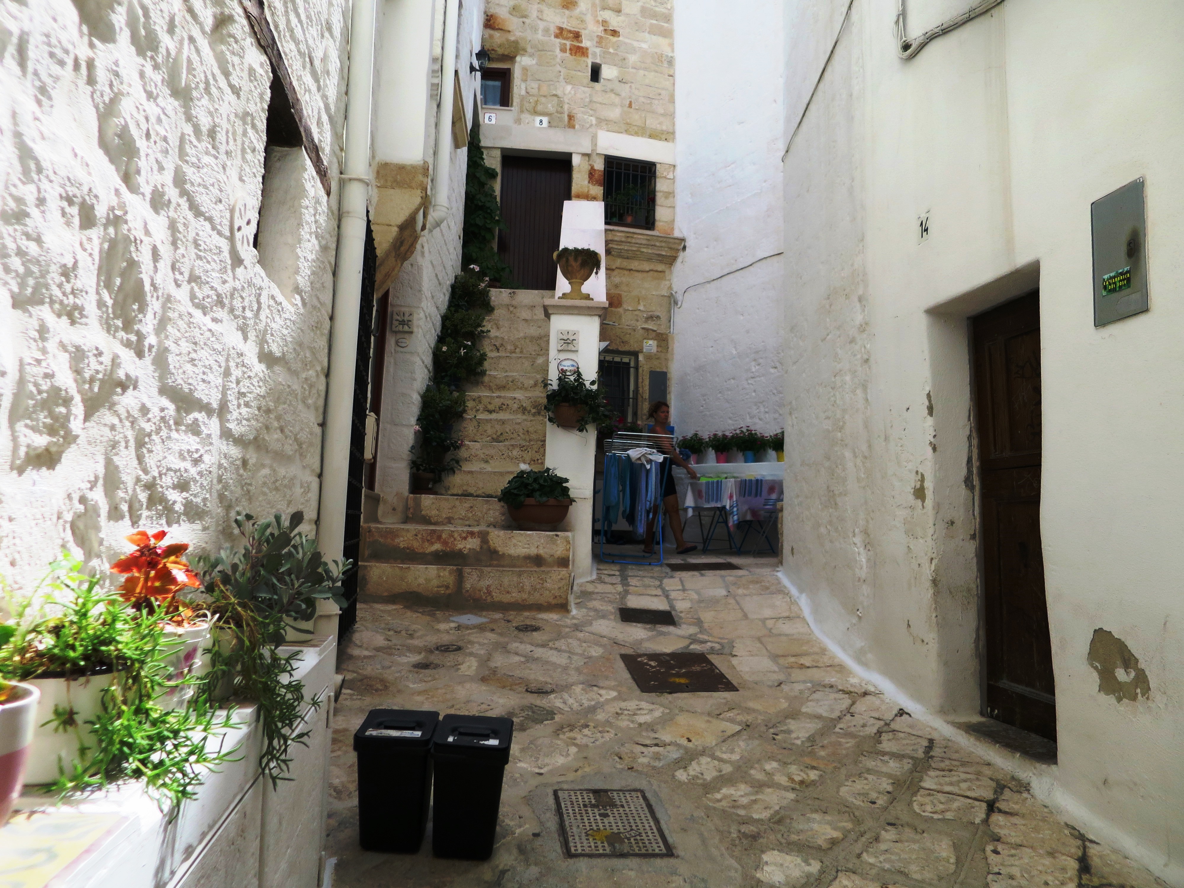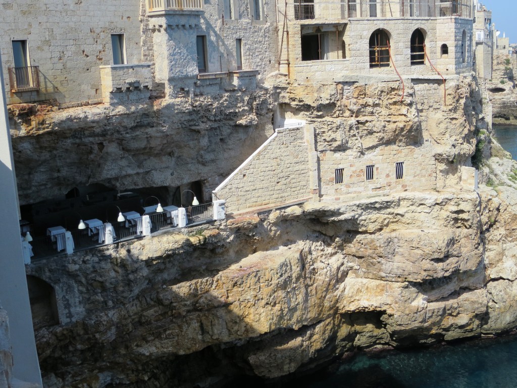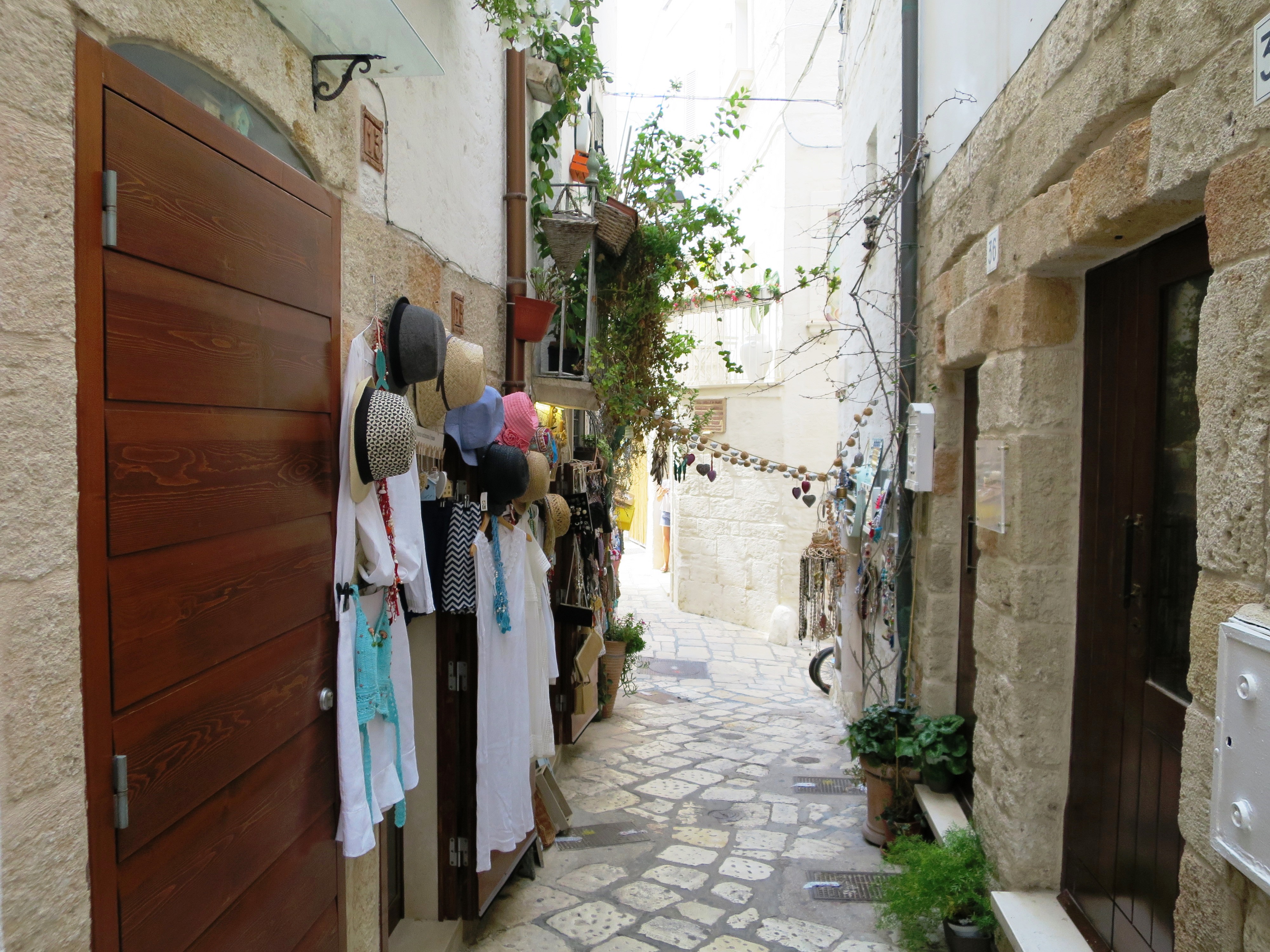 Die Gässchen sind voller kleiner Geschäfte, bunt dekoriert, liebenswürdig und sehr lebendig. Leider hatte das berühmte Felsenrestaurant Grotta Palazzese wegen Renovierungsarbeiten geschlossen, wäre aber wahrscheinlich sowieso nicht unsere Preisklasse gewesen. Ein Menü für 2 Personen kostete dort schlappe 300 Euro.