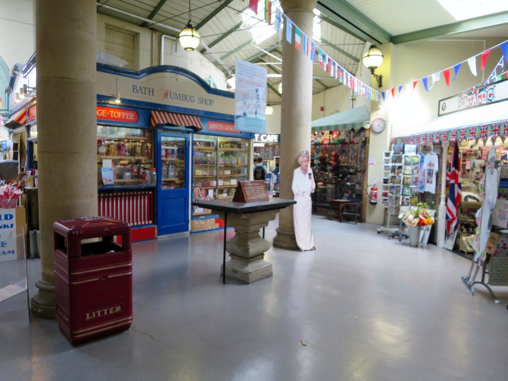 Dann war da noch der Bath Guildhall Market. Ein ‚Indoor-Market‘ und der älteste der Stadt. Hier bekommt man auf kleinster Fläche alles, was man so benötigt. Von Elektrogeräten und Werkzeugen bis über Tee, Kaffee, Käse, Stickgarn, Süssigkeiten, Gemüse, Feinkost, Schmuck und vieles mehr. Und die Queeny darf natürlich nicht fehlen. Übrigens … offenbar hatte ich einen guten Moment erwischt. In Wirklichkeit war der Markt nicht so leer ..