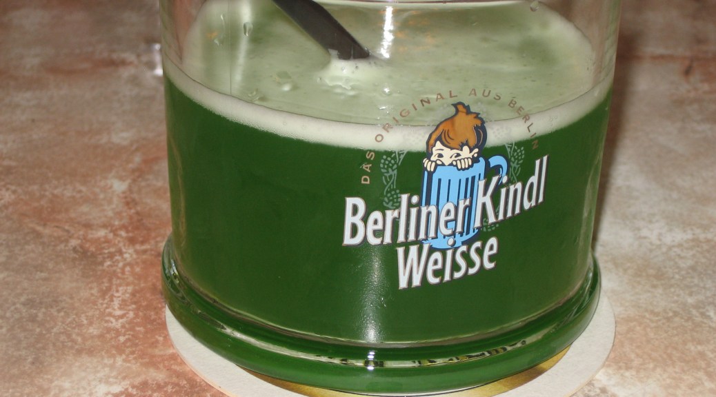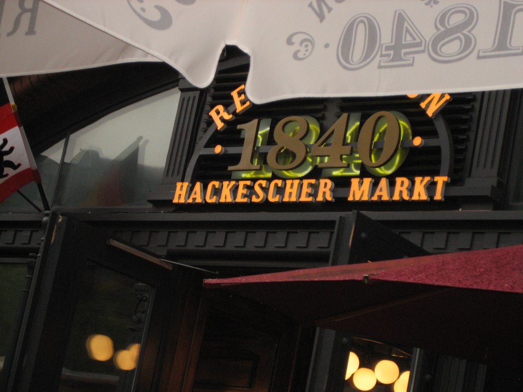 Als nächstes an diesem Abend machten wir uns auf die Suche nach etwas Essbarem, was in Berlin ja keine Schwierigkeit darstellt. Wir bummelten über den Alexanderplatz Richtung Hackescher Markt, wo unter den riesigen Sonnenschirmen der einzelnen Lokale die Tische gut besetzt waren. Die Schirme waren auch nötig … es fing an zu regnen und der Wind war recht kühl. Trotzdem blieben wir draussen und ich freute mich auf eine deftige Berliner Kartoffelsuppe. Ausserdem auf eine Berliner Weisse mit Waldmeister. Für mich gibt es in Berlin kein besseres Getränk, allerdings hat einer unserer früheren Aufenthalte mich gelehrt, dass man besser nur eine aufs Mal trinkt. Es schmeckt zwar irgendwie nach Brause, aber nach dem zweiten Glas hat es eine ganz andere Wirkung
