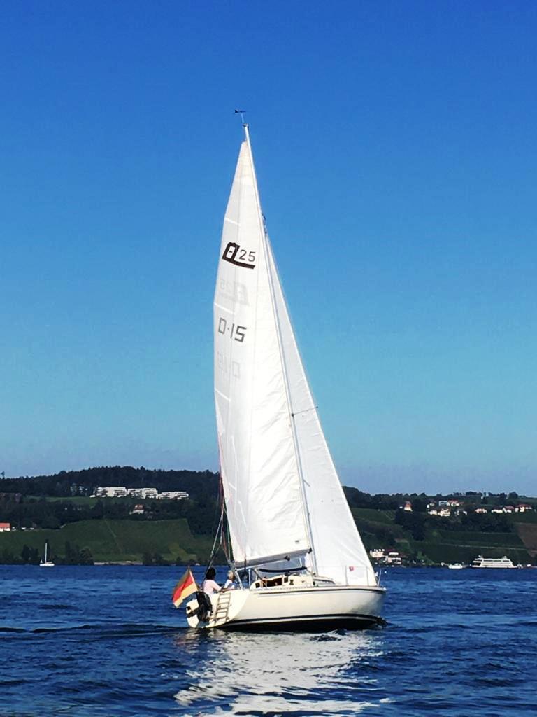 Nur eine kurze Segel-Etappe war an diesem Tag angesagt. Ein paar Häfen weiter nach Arbon. Wir konnten ein kleines Stück segeln, dann stellte der Wind ab. Wieder war es ein sehr heisser Tag, kaum auszuhalten. Und so nutzten wir die Gelegenheit, mitten auf dem See zu baden und einfach zu faulenzen. Unser ‚Segel-Verhalten‘ hatte sich in der letzten Zeit verändert. Gott sei Dank! Noch vor ein paar Jahren hätten wir bei Flaute ewig lang auf Wind gewartet. In solchen Situationen fragte ich mich früher insgeheim, ob der Motor wohl tot sei. Das wäre für mich der einzig akzeptable Grund gewesen, ihn nicht zu starten. Doch jeweils – kurz bevor ich durchgebraten war – warf mein Mann ihn doch noch an. Juche, er lebte, der Motor. Heute ist das alles viel relaxter. Kein Wind … keiner in Aussicht … Motor an wink.
