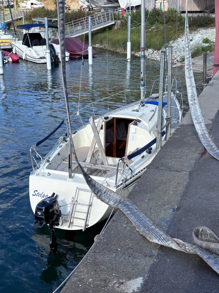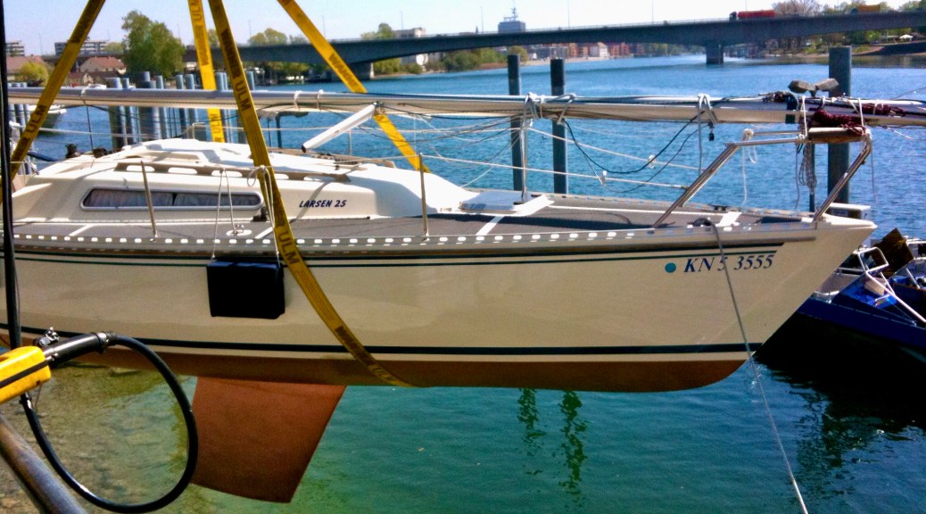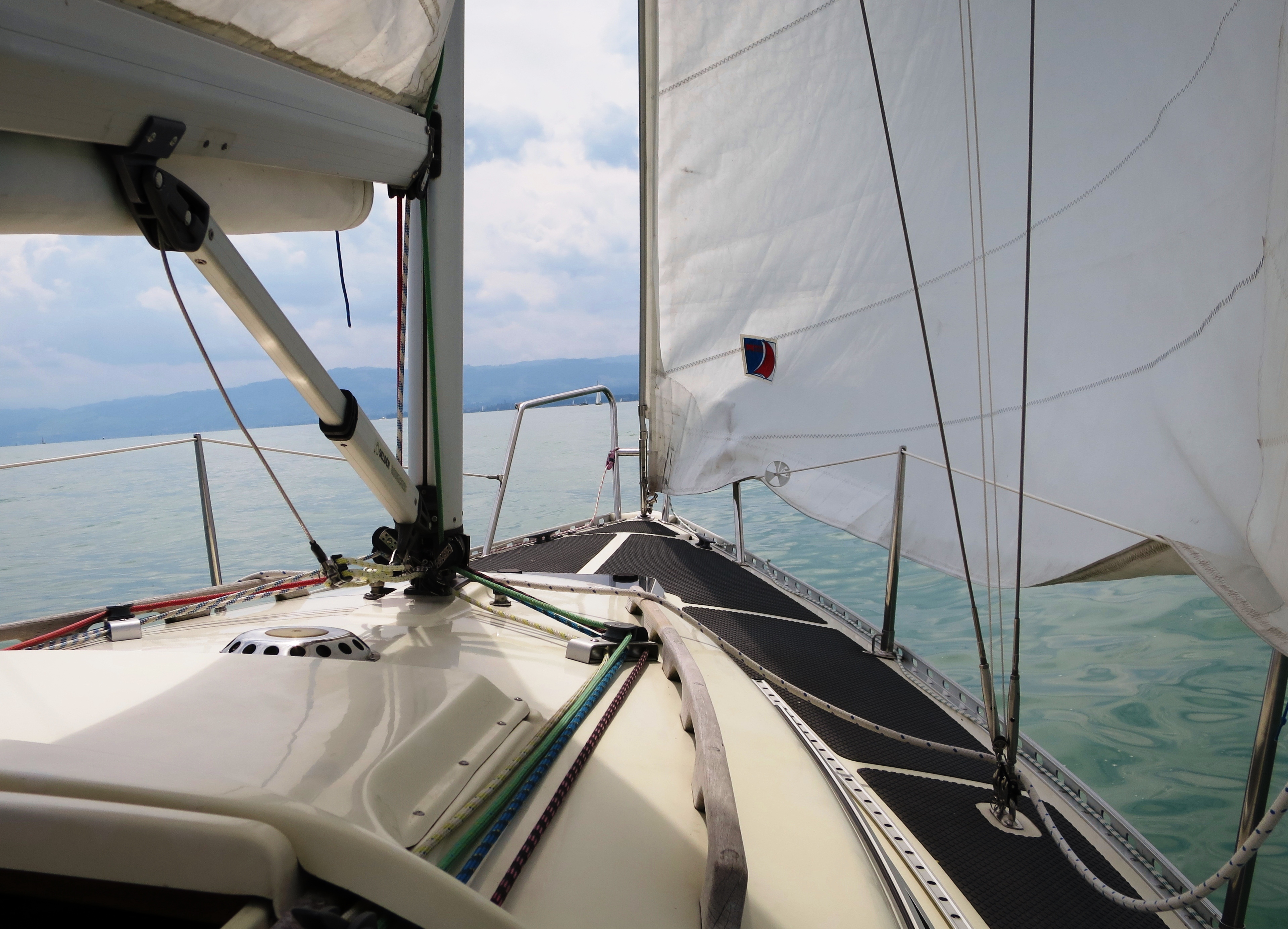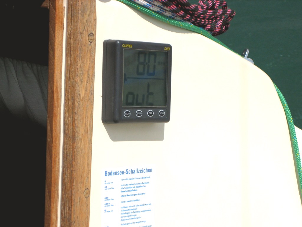 Zu diesem Zeitpunkt war die Laune meines Mannes kurzfristig im Keller. Die geliebten neuen Crogs waren nicht da, wo sie eigentlich stehen sollten. Sie waren nirgendwo. Wir suchten das ganze Schiff ab und fanden alles Mögliche, nur die blauen Dinger nicht. Sah so aus, als ob sie nicht mitgesegelt wären von Lochau nach Altenrhein. Ärgerlich. Und wir sind heute noch am hirnen, wie das passieren konnte. Wahrscheinlich stehen sie jetzt noch auf dem Steg. Aber alles wurde gut … er hat Neue :-).