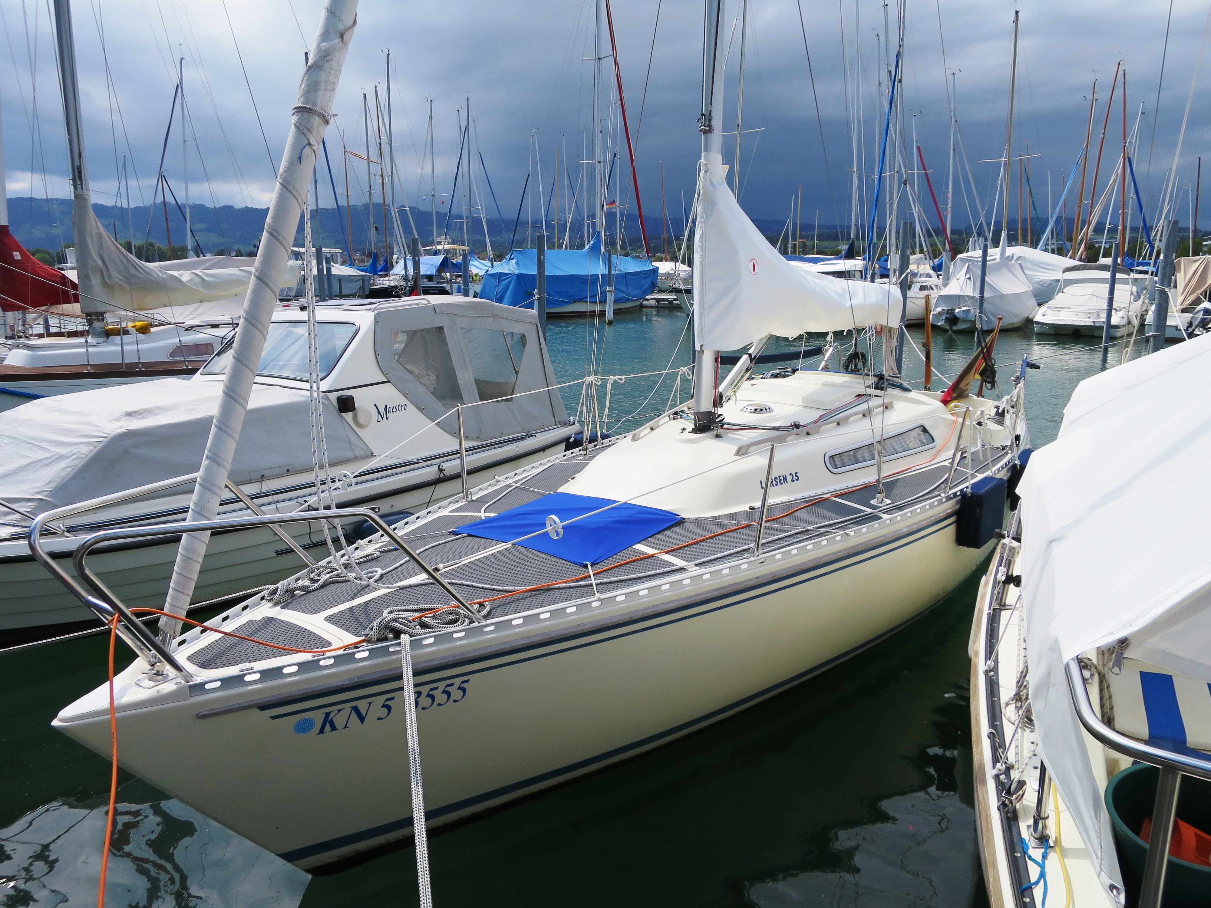 Ich war sehr erleichtert, als wir in den Hafen einfuhren. Allerdings nicht lange. Wir klapperten Gasse um Gasse ab, fanden viele freie Plätze, aber alle frei/besetzt Täfelchen standen auf rot. Wir waren nicht die einzigen, die einen Platz suchten und der Betrieb im Hafen war dementsprechend. Das sah genauso düster aus wie die Wolken über uns und meine Stimmung sank. Das ist übrigens eine Unart, die in verschiedenen Häfen inzwischen an der Tagesordnung zu sein scheint. Es gibt jede Menge freier Plätze, aber die Inhaber stellen die Tafeln nicht auf grün. Den Hafenmeister konnte man auch nicht fragen, der war erst am späten Nachmittag in der Anlage. Tja, sah so aus, als ob unsere Reise weiterging. Und wohin? Wir wollten es in Immenstaad versuchen. Dann mal los …