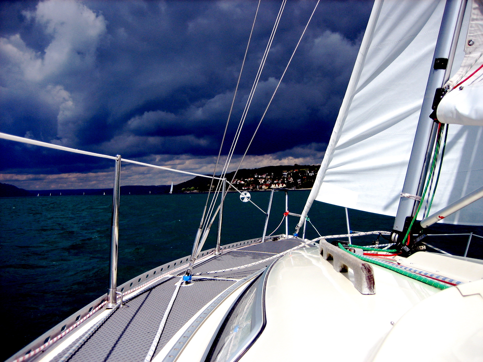 Die Temperaturen sollten laut Vorhersage nicht nur auf 38 Grad steigen, es waren auch unwetterartige Gewitter angesagt Wir beschlossen, an diesem Tag nach Friedrichshafen, der Zeppelinstadt am Bodensee, zu segeln. Einmal quer über den See. Der Wind war gut und wir kamen prima vorwärts. Das Wetter war nicht so recht durchschaubar, der Wind heiss wie in der Wüste. Ganz sicher kam da noch was. Ich war froh, als der Hafen in Sicht kam. Nicht zuletzt deshalb, weil ich an diesem Tag entweder zuviel Sonne abbekommen oder zuwenig getrunken hatte – oder beides – und es mir gar nicht besonders wohl war.