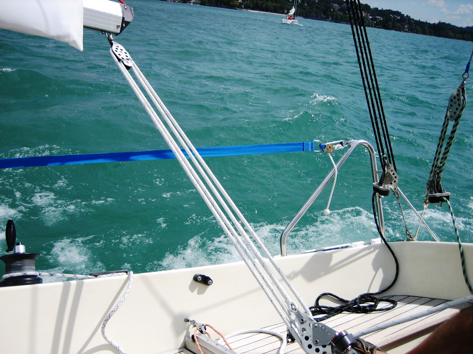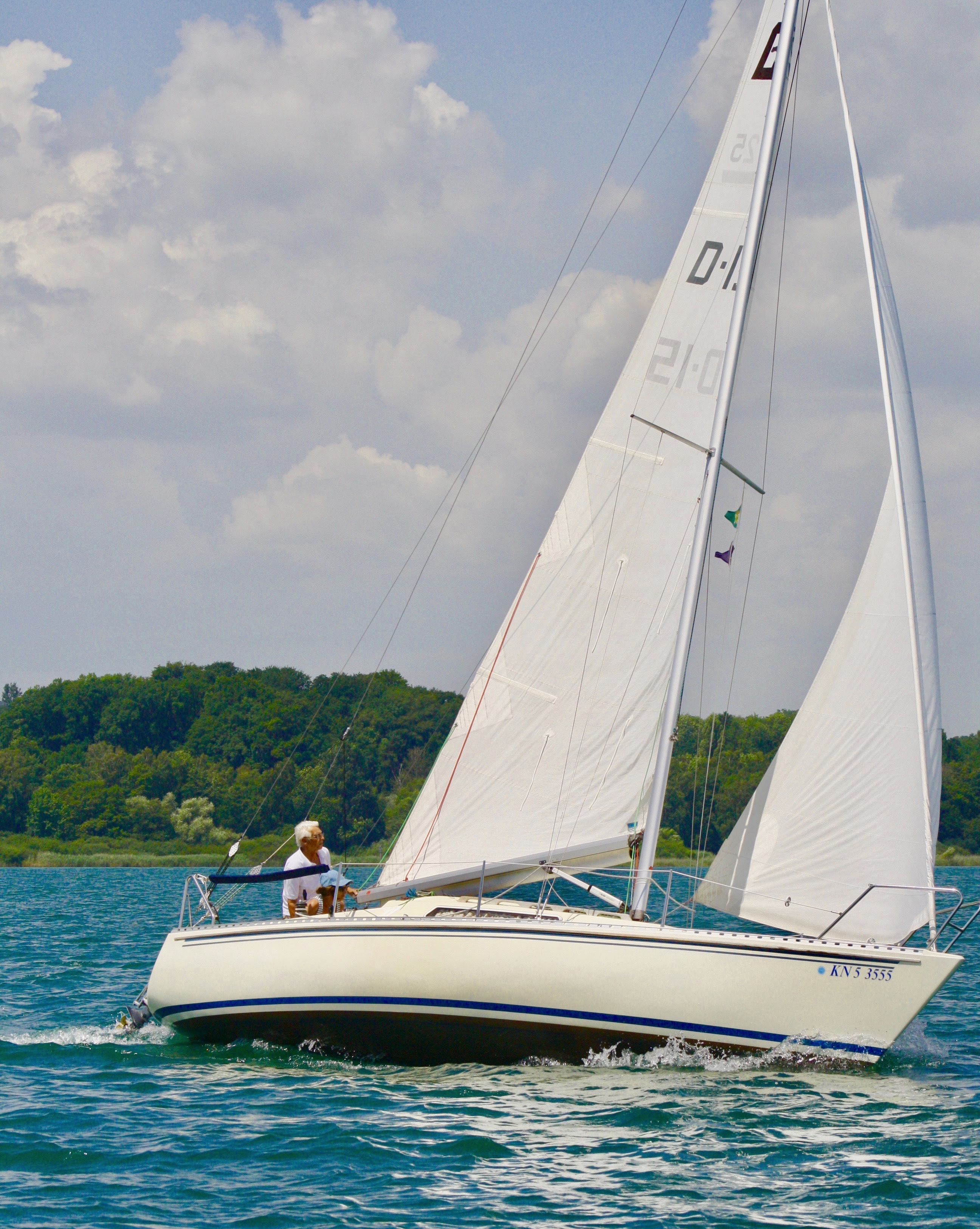 Der kommende Tag war einer der schönsten unserer Ferien. Mit perfektem Wind und bei strahlendem Sonnenschein segelten wir unsere letzte Destination an, Überlingen. Ein herziges – und bei Touristen sehr beliebtes – Städtchen am nördlichen Bodenseeufer.  Doch leider machten wir auch hier die Erfahrung, dass man – wenn man nicht schon um 12:00 im Hafen ist – keinen Platz mehr bekommt. Das war im Yachtclub Überlingen der Fall. Wir waren eigentlich am Nachmittag mit Tochter, Schwiegersohn und Enkelmäuschen verabredet. Darauf hatte ich mich sehr gefreut und schon machte sich Enttäuschung breit, dass das Treffen ins Wasser fallen würde. Unsere letzte Chance war der Hafen Überlingen Ost. Ansonsten hätten wir heimsegeln müssen.