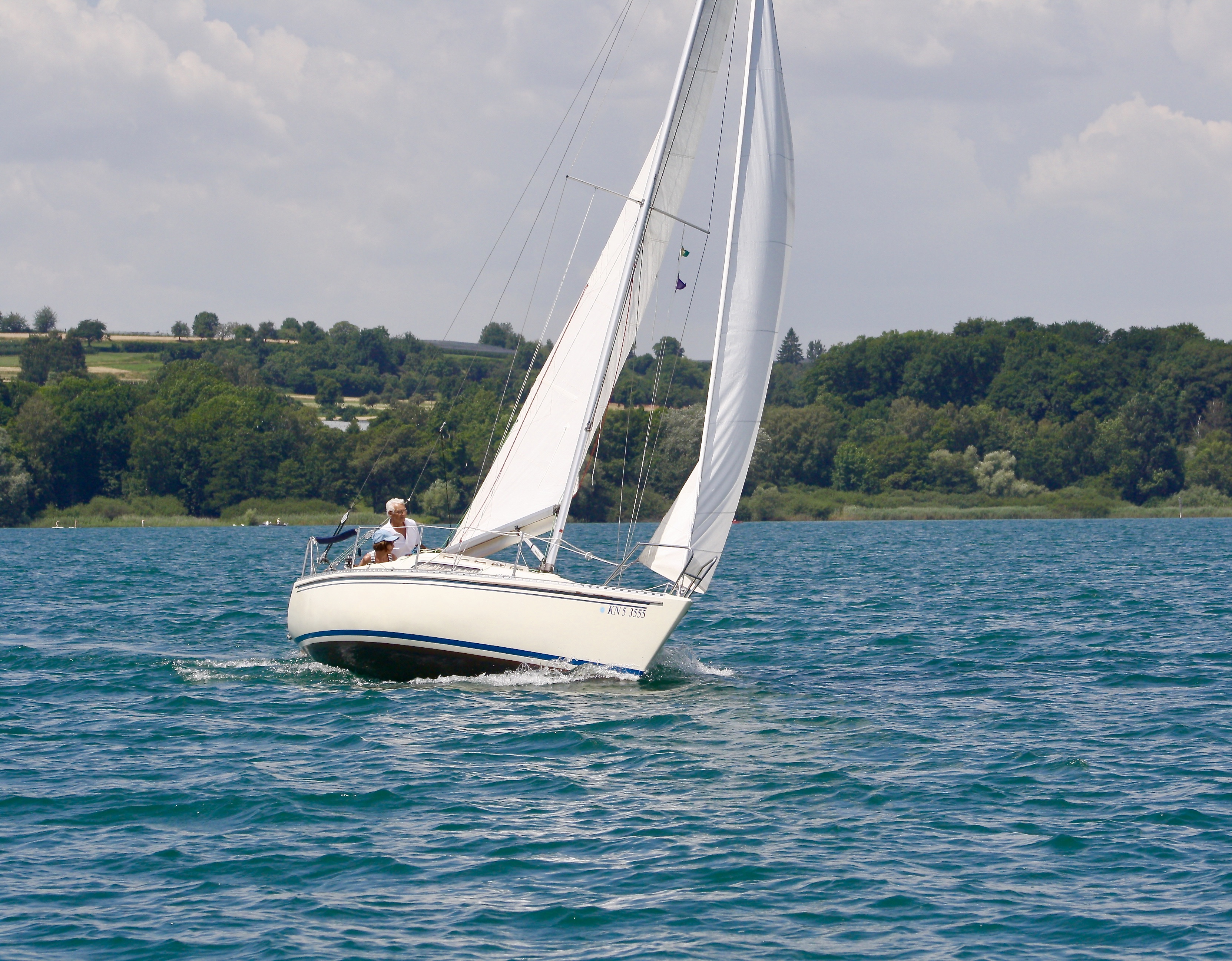 Wenn man von Altenrhein spricht, weiss jeder Segler, welcher Hafen gemeint ist. Dieser Schweizer Hafen war unser nächstes Ziel. Es war bewölkt, aber schon wieder sehr heiss und es ging ein wunderbarer Wind, so dass wir ohne Motor ans Ziel kommen würden. Irgendwo auf dem See trafen wir ein älteres Ehepaar mit dem gleichen Boot, welches wir segeln. Da diese auf dem See nicht so weit verbreitet sind, war das natürlich ein willkommener Anlass zu einem Plausch auf dem See.