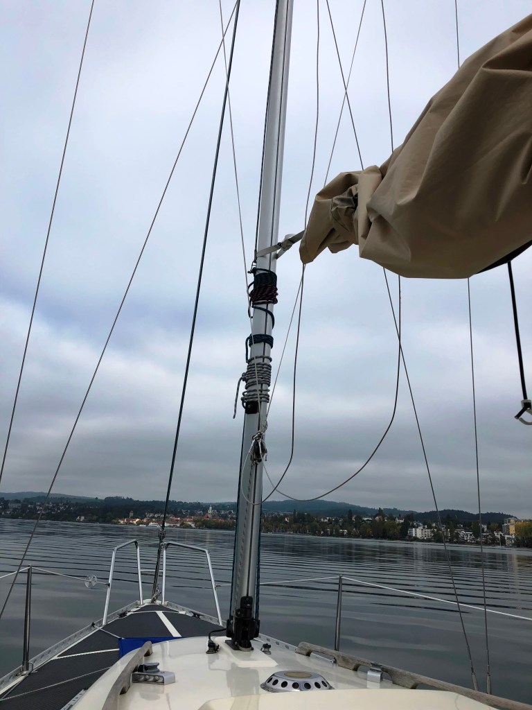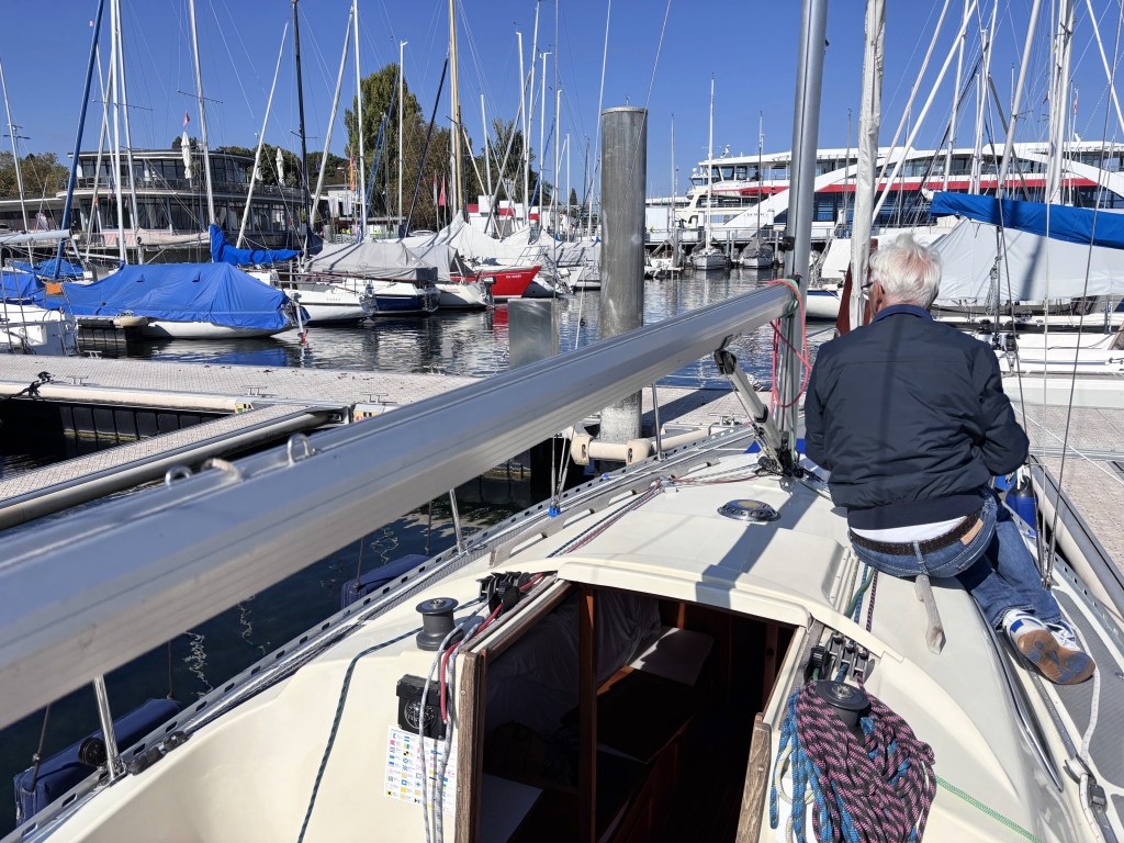 Die Tagesabläufe auf dem See unterscheiden sich nicht sehr. Aber gerade das verschafft mir eine innere Ruhe und sehr rasch den nötigen Abstand zum Alltag. Man kann alles und muss gar nichts. Nach gemütlichem Frühstück und duschen rüsten wir uns gaaanz langsam für die Weiterreise. Wir schauen, ob es Wind hat und wohin der uns wohl am besten bringt und beratschlagen, was unser nächstes Ziel sein wird. Aber erst einmal wird noch die Kajüte aufgeräumt und die Kojen gemacht. Am Abend denke ich jeweils, dass wird nie wieder ordentlich. Aber wenn wir dann auslaufen, ist immer alles piccobello. Vor dem Auslaufen gibt es immer noch ein lieb gewordenes Ritual: einen Abschieds-Cappuccino.