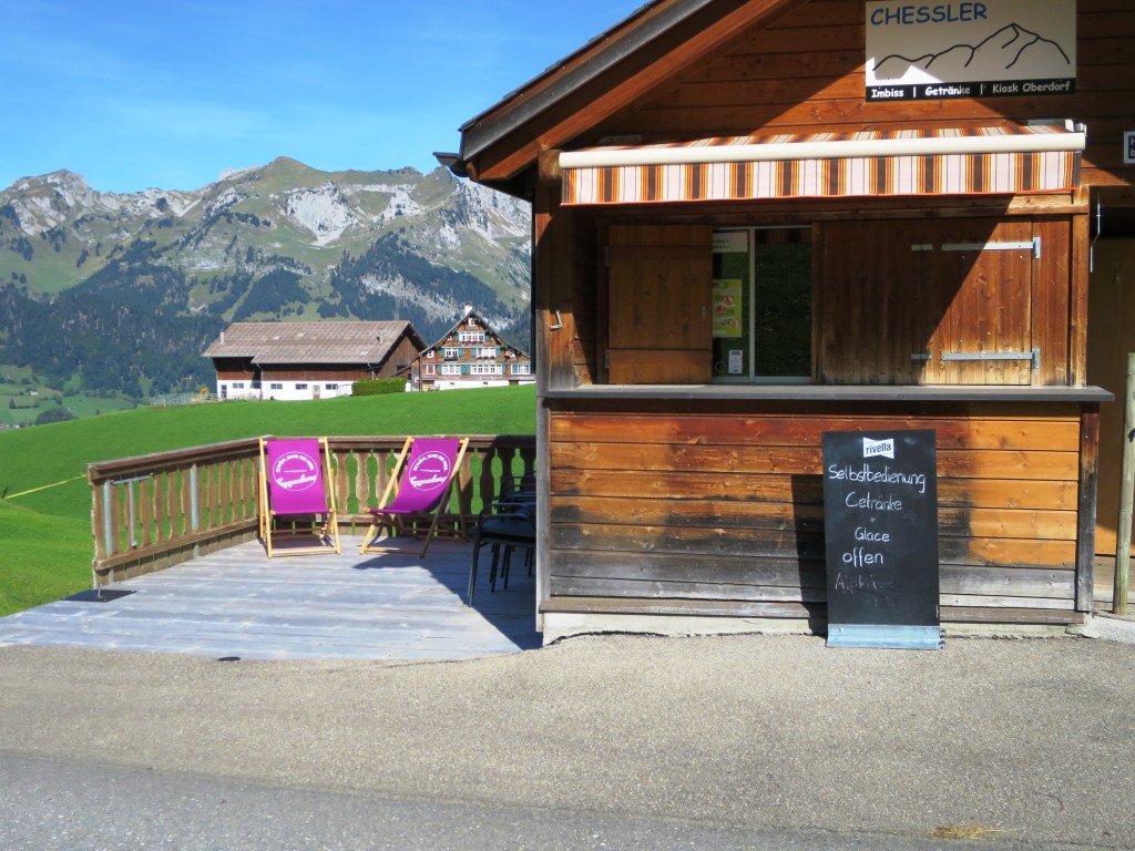 Falls sich schon vor der Wanderung erste Ermüdungserscheinungen bemerkbar machen, kann man bei einem kleinen Selbstbedienungskiosk die Seele baumeln lassen oder ein Getränk oder Eis geniessen.