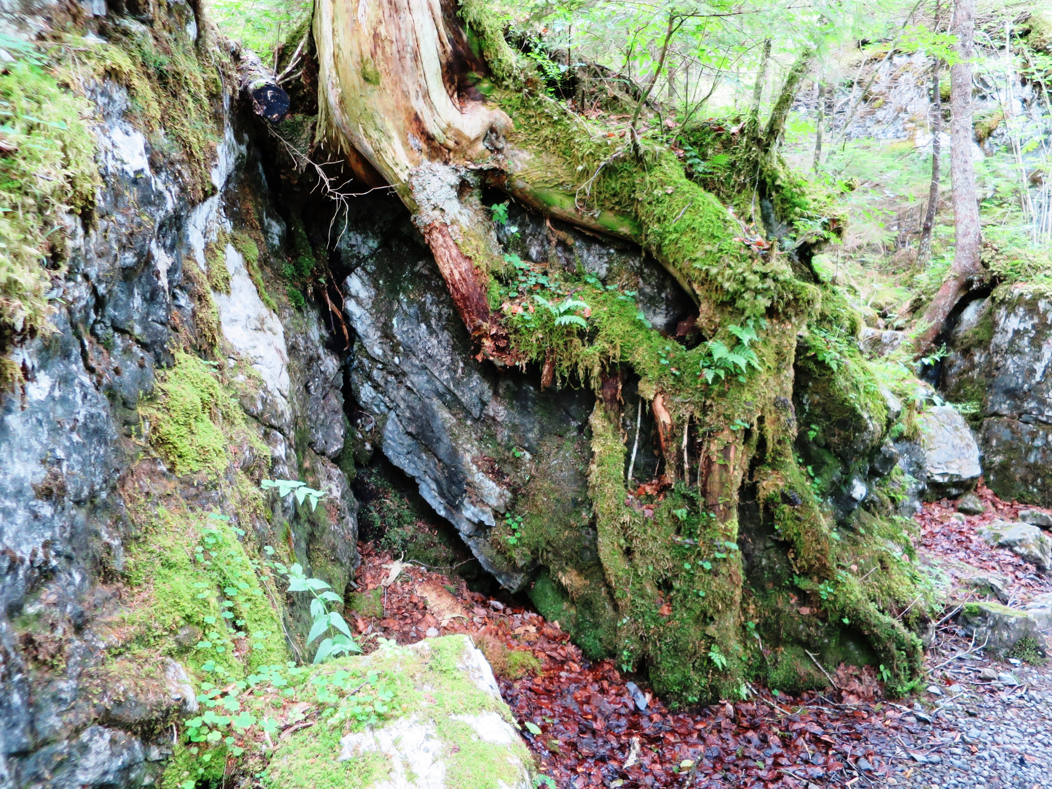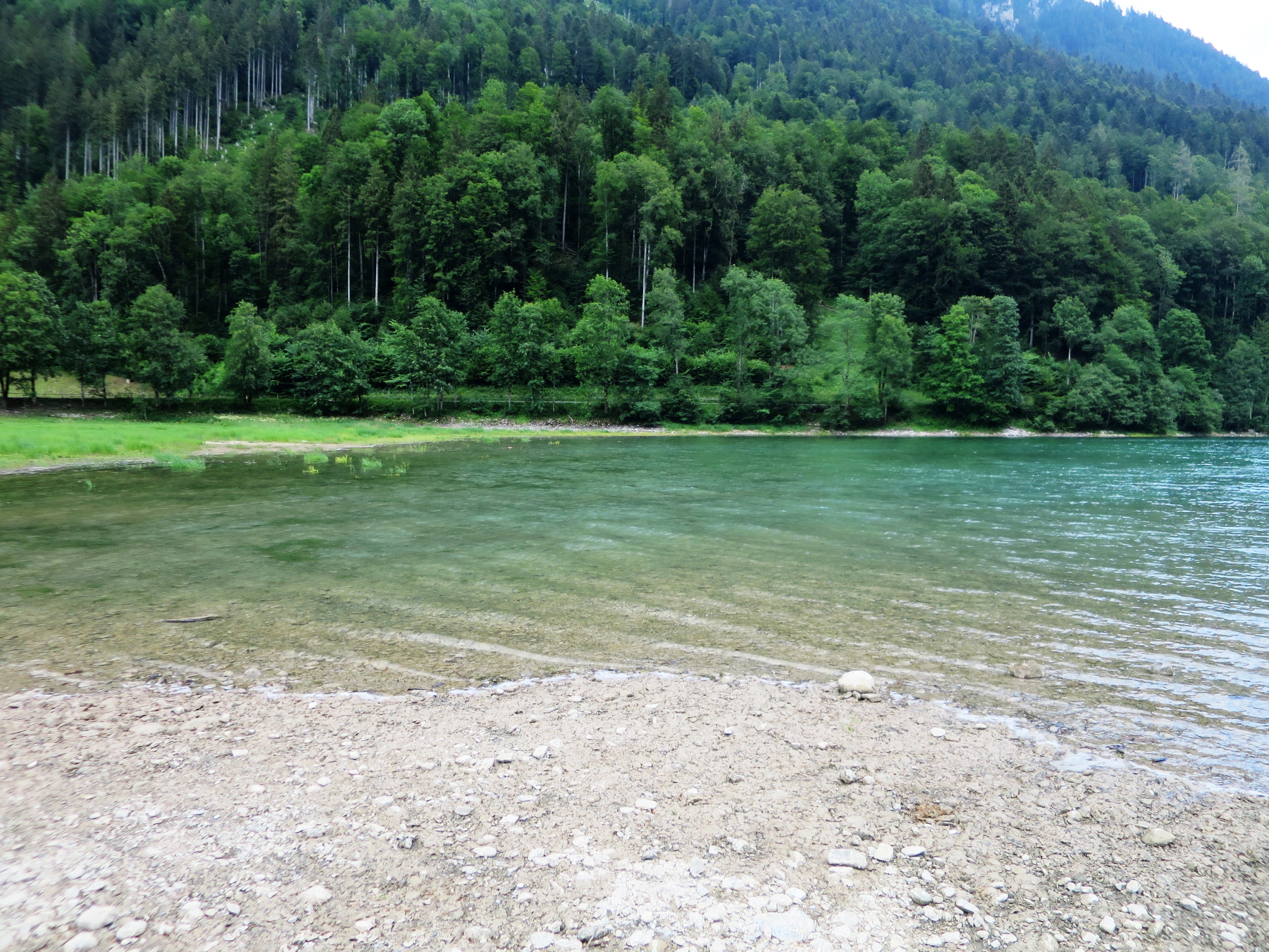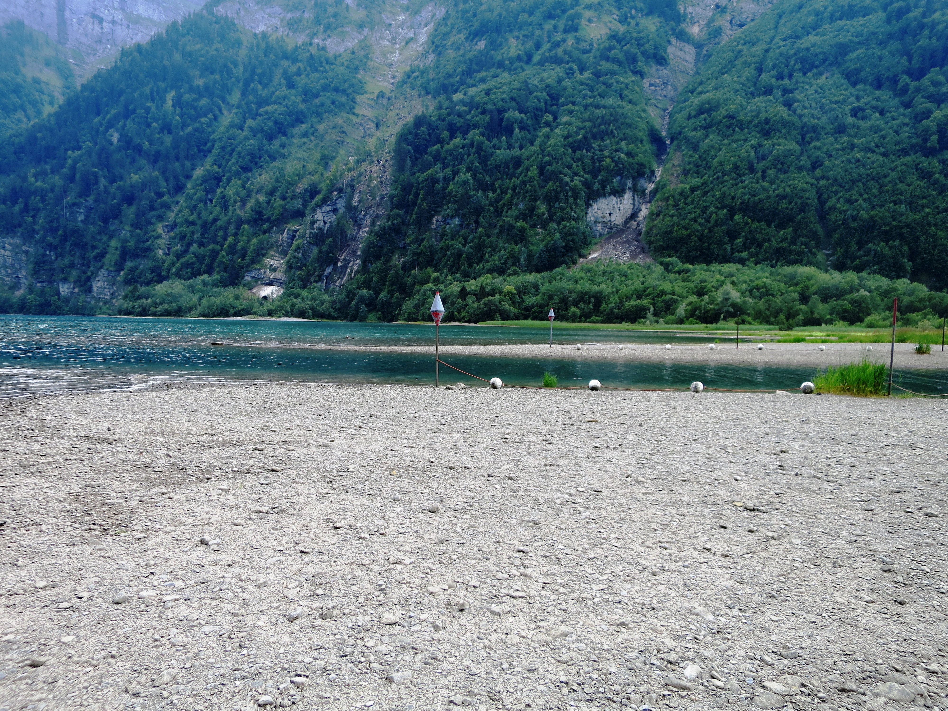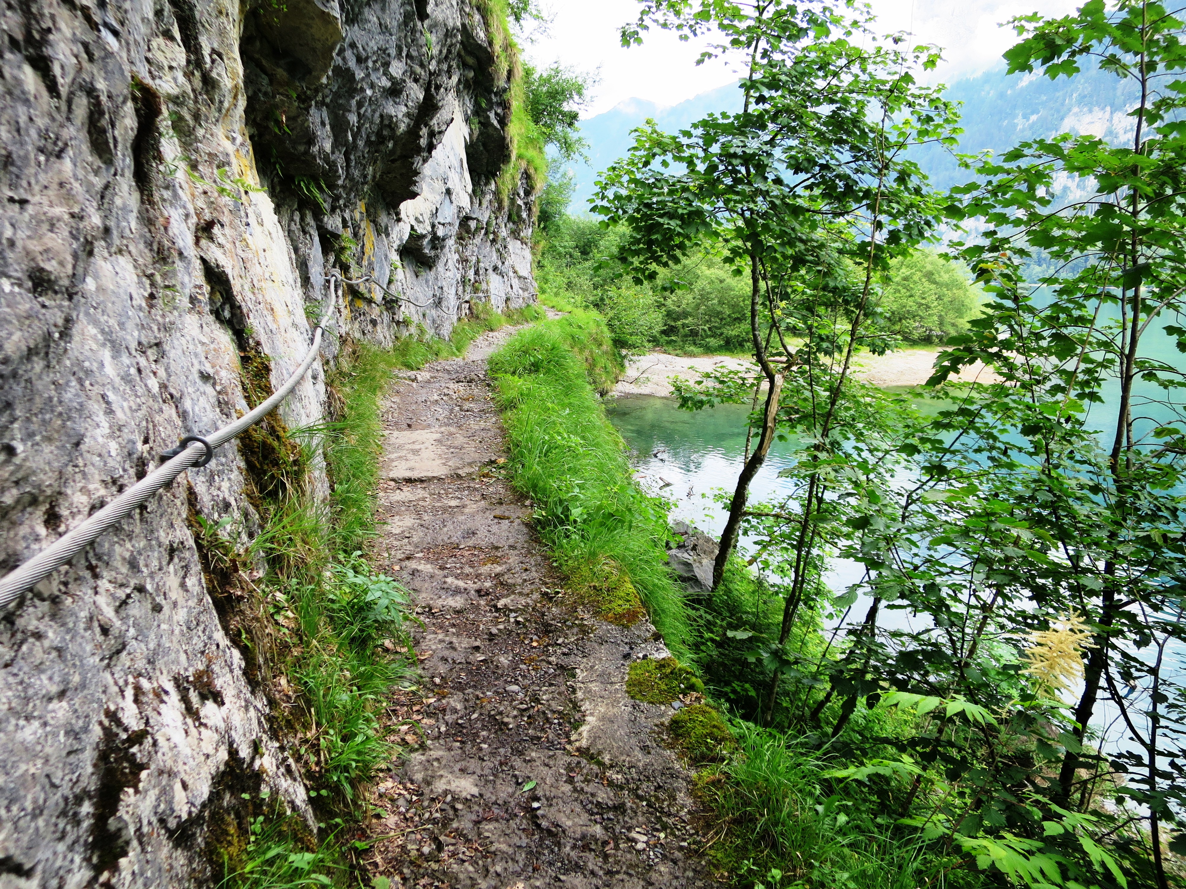 > Hinter der Brücke über den Darlibach endet der breite Weg, der Uferweg verläuft schmal und ist auf der Seeseite abschüssig.