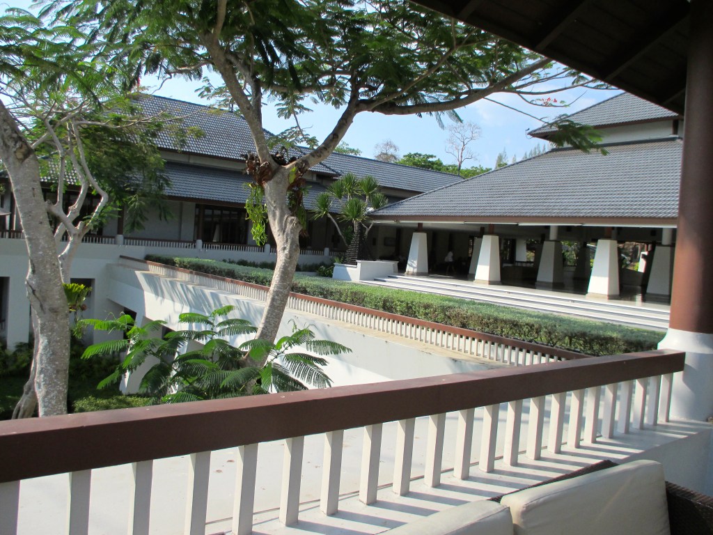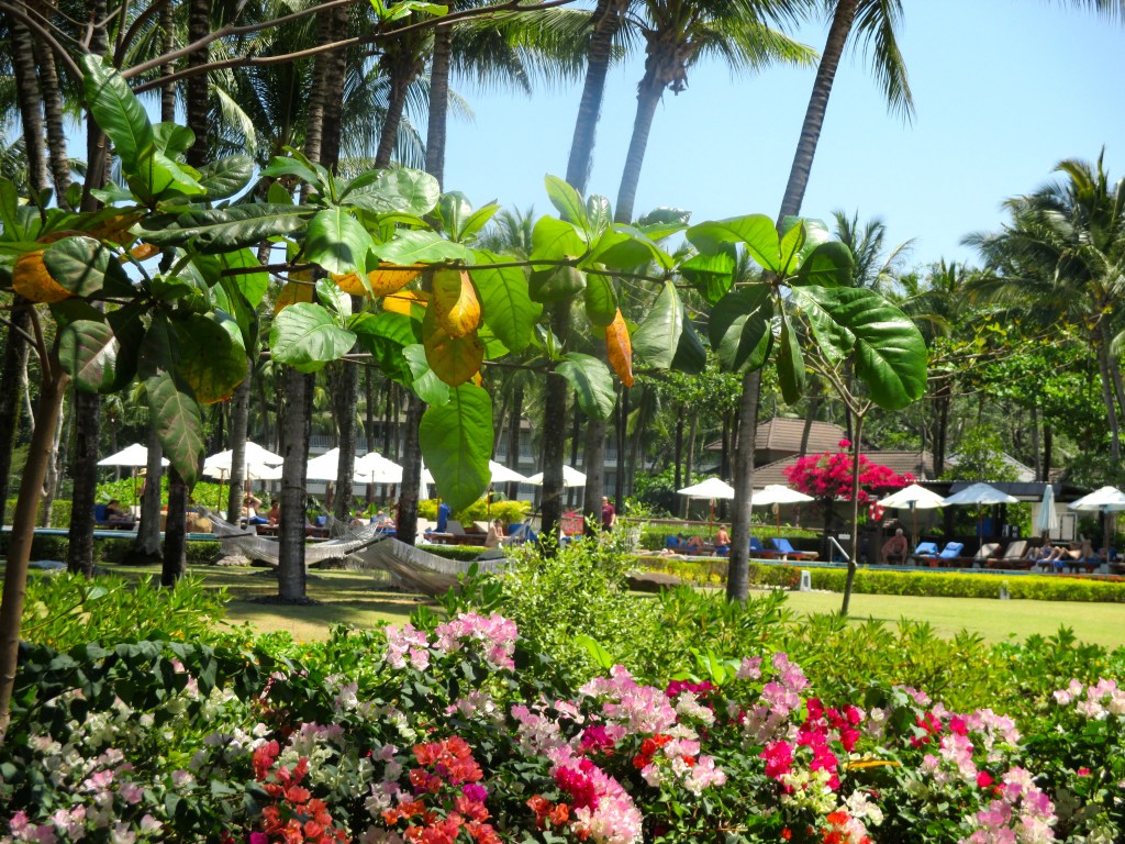 Ein Golfwägelchen brachte uns in dieser Riesenanlage zu unserem Zimmer. Ziemlich müde und ein bisschen durch den Wind, genossen wir die kühle Dämmerung, die uns hier empfing. Der Raum war wirklich schön – geräumig und mit einem grossen Bad. Doch, hier konnte man es aushalten.  Der Balkon war um diese Uhrzeit noch schattig. Wir schauten auf einen kleinen Teich unter uns und hatten einen  wunderbaren Blick in die Gartenanlage des Hotels, im Hintergrund das Meer.