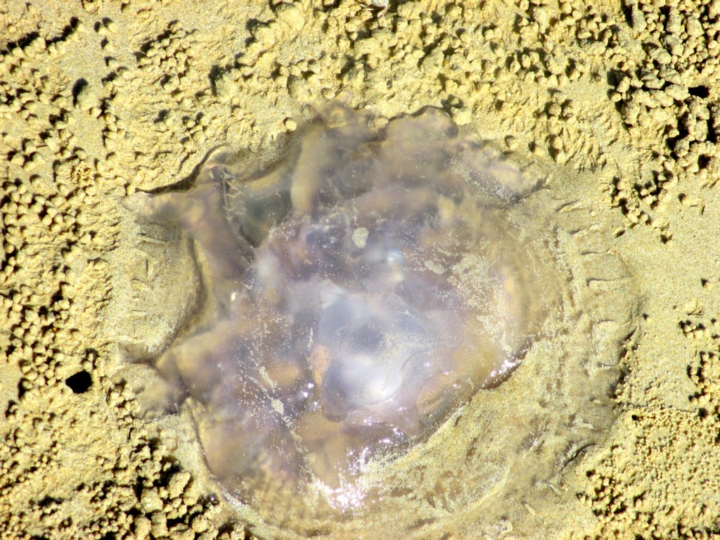 Vor lauter gucken stolperte ich in der Zwischenzeit fast über etwas Glibbeliges im Sand, das sich aber nicht mehr rührte. Eine Qualle. An diesem Tag fand sich alle paar Meter so ein Meeresbewohner, mal grösser, mal kleiner. Offenbar wurden sie jeweils mit der Flut angespült.