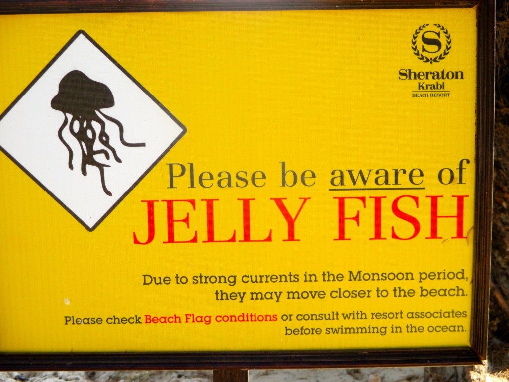 Im Wasser bemerkte man die Quallen nicht, da sie fast durchsichtig waren. Wenn ich rausgeschwommen bin – was man übrigens auch bei Ebbe gut konnte – , versuchte ich, einfach nicht daran zu denken. Ich hatte Glück … offenbar hatte kein jelly fish Lust, an mir anzudocken.