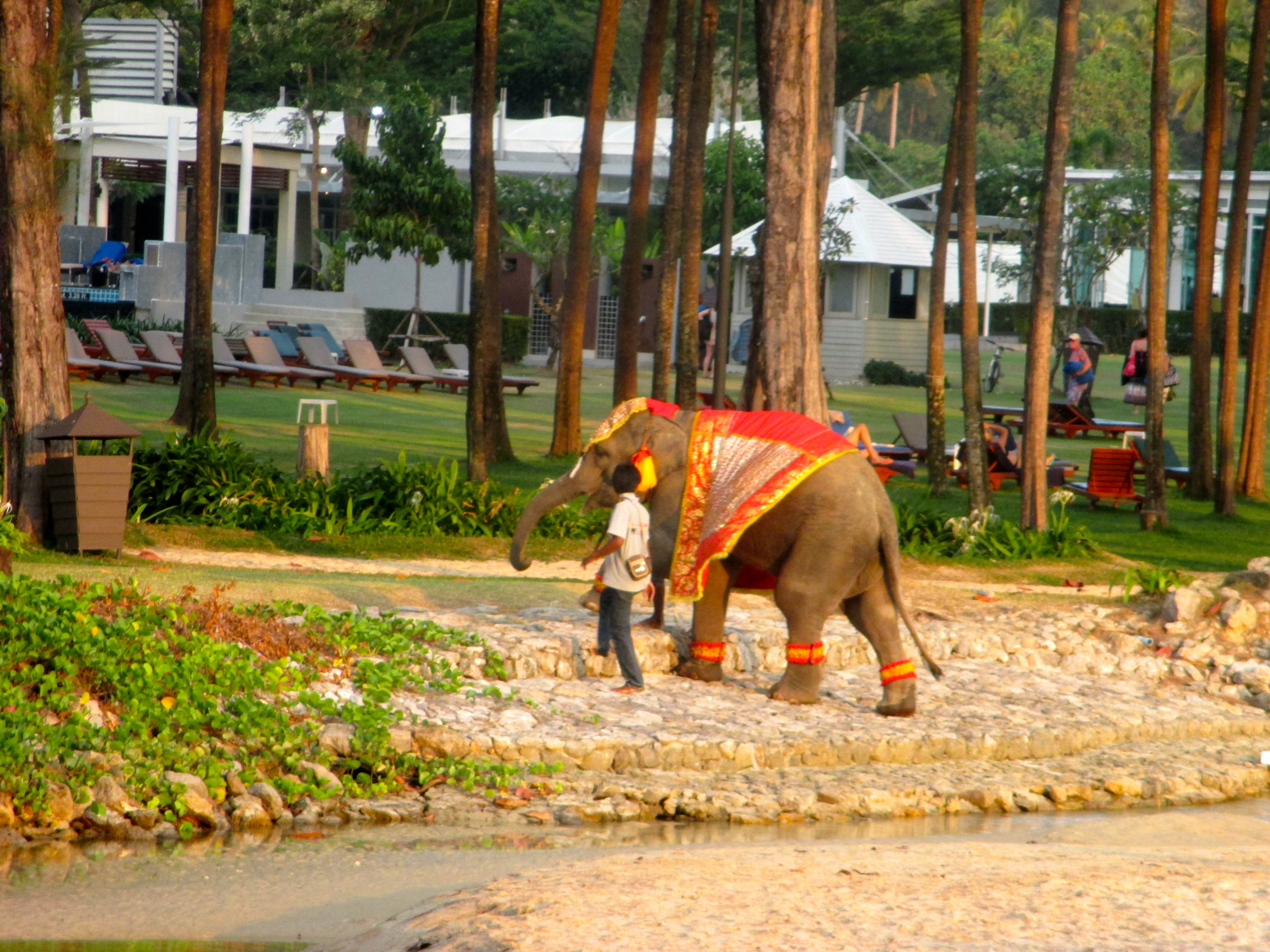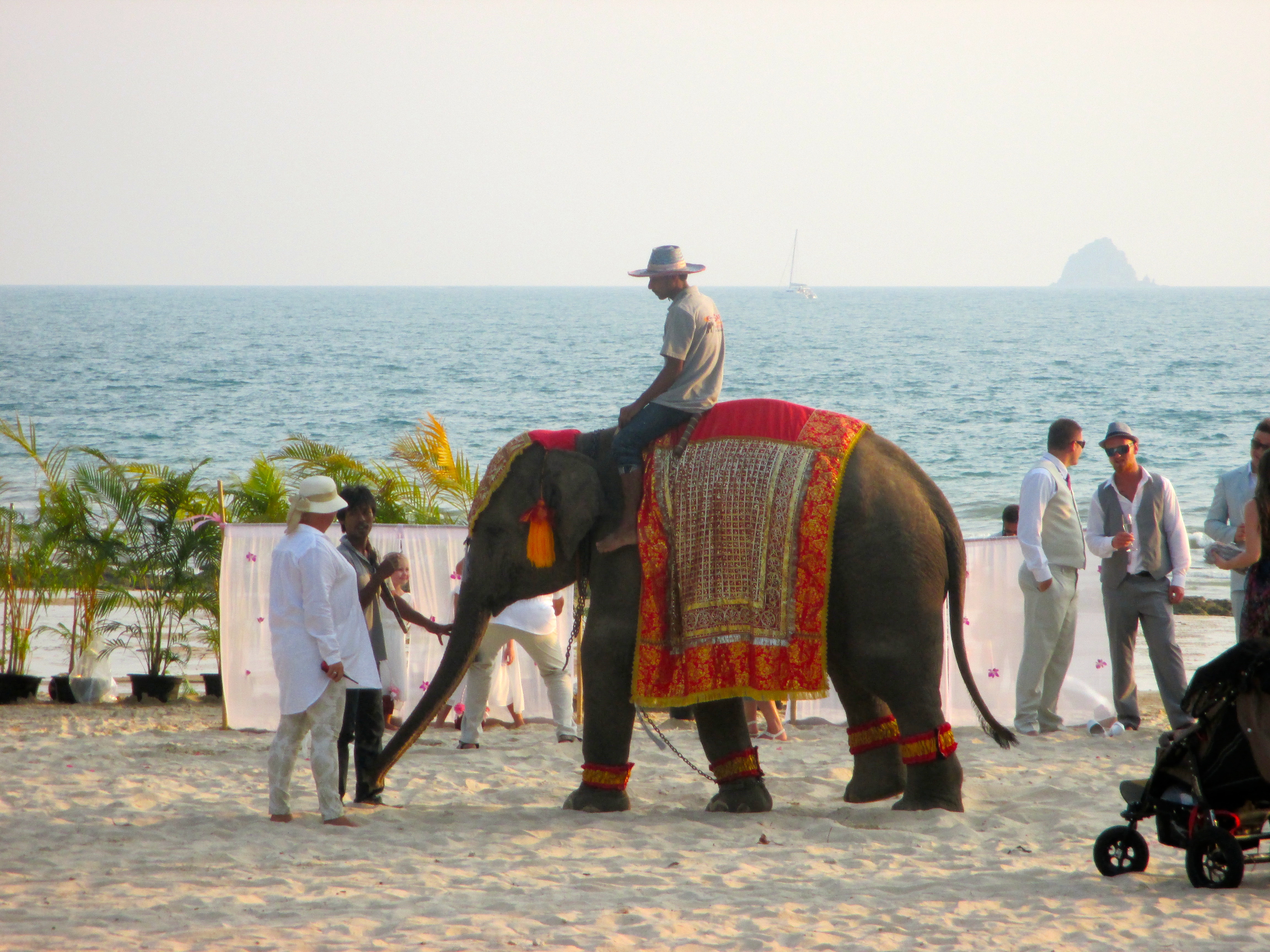 Das konnten nur Hochzeitsvorbereitungen sein. Genau so war es.  Die Trauzeremonie fand ein paar Stunden später am Strand statt. Offenbar hatte das Hochzeitspaar (… oder die Eltern) an nichts gespart. Neben dem ganzen sonstigen Gedöns durfte ein Elefant als Glücksbringer natürlich nicht fehlen.