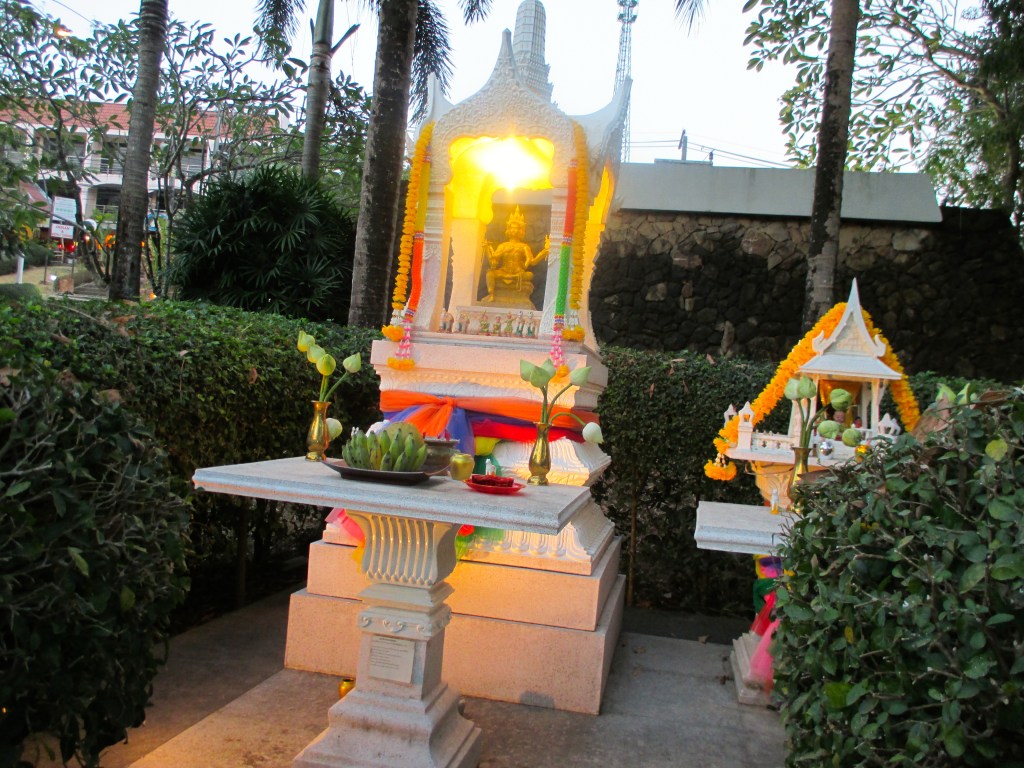 Ca. 40 Minuten dauerte die Fahrt vom Flughafen Krabi zu unserem Hotel. Uns erschloss sich eine neue, exotische Welt. Üppige, fast schon dschungelartige Natur, ungewohnter Linksverkehr, abenteuerliche Überholmanöver, Mopeds mit der ganzen Familie darauf, winzige Läden und wunderschöne Geisterhäuschen.