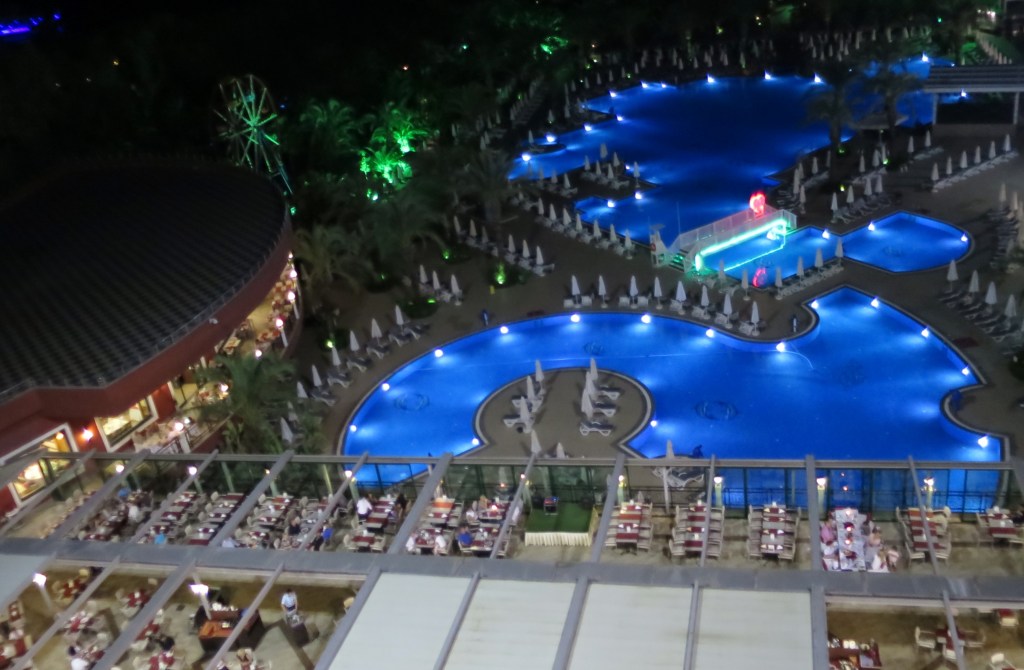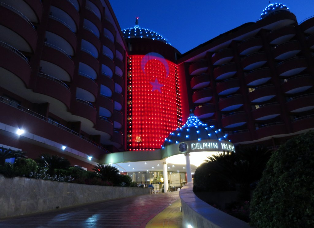 Und schon ging es los im komfortablen Mini-Van durch die hell erleuchteten Strassen von Antalya. Bis Lara sind es etwa 30 Minuten, die Gegend wurde ländlicher und dunkler. Ich konnte die Gedanken an das Attentat in Ankara nicht abschütteln, zu frisch waren noch die Schreckensmeldungen. Und dann gingen mir die unmöglichsten Dinge durch den Kopf. Was, wenn wir jetzt entführt wurden? Der Fahrer und sein Kollege unterhielten sich und lachten … und setzten uns wohlbehalten vor dem Hotel ab. Ich musste über meine heimlichen Ängste selbst den Kopf schütteln, aber ein ganz kleines bisschen erleichtert war ich doch, als wir das Hotel vor uns sahen.