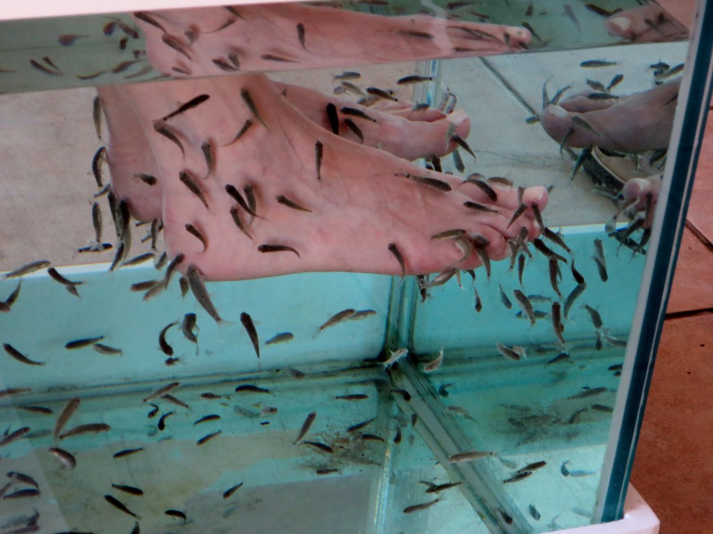 Nachdem ich an mehreren Tagen an diesen Gefässen vorbei gelaufen war, siegte dann doch meine Neugier und ich beschloss, meine Füsse mal in das Wasser zu halten. Die kleinen Fische stürzten sich darauf wie hungrige Piranhas. Das Ganze sah ziemlich komisch aus, fühlte sich aber nicht schlecht an. Nachdem ich den ersten Lachanfall wegen dieser Kitzelei unterdrückt hatte, gewöhnte ich mich an das Geknabber.