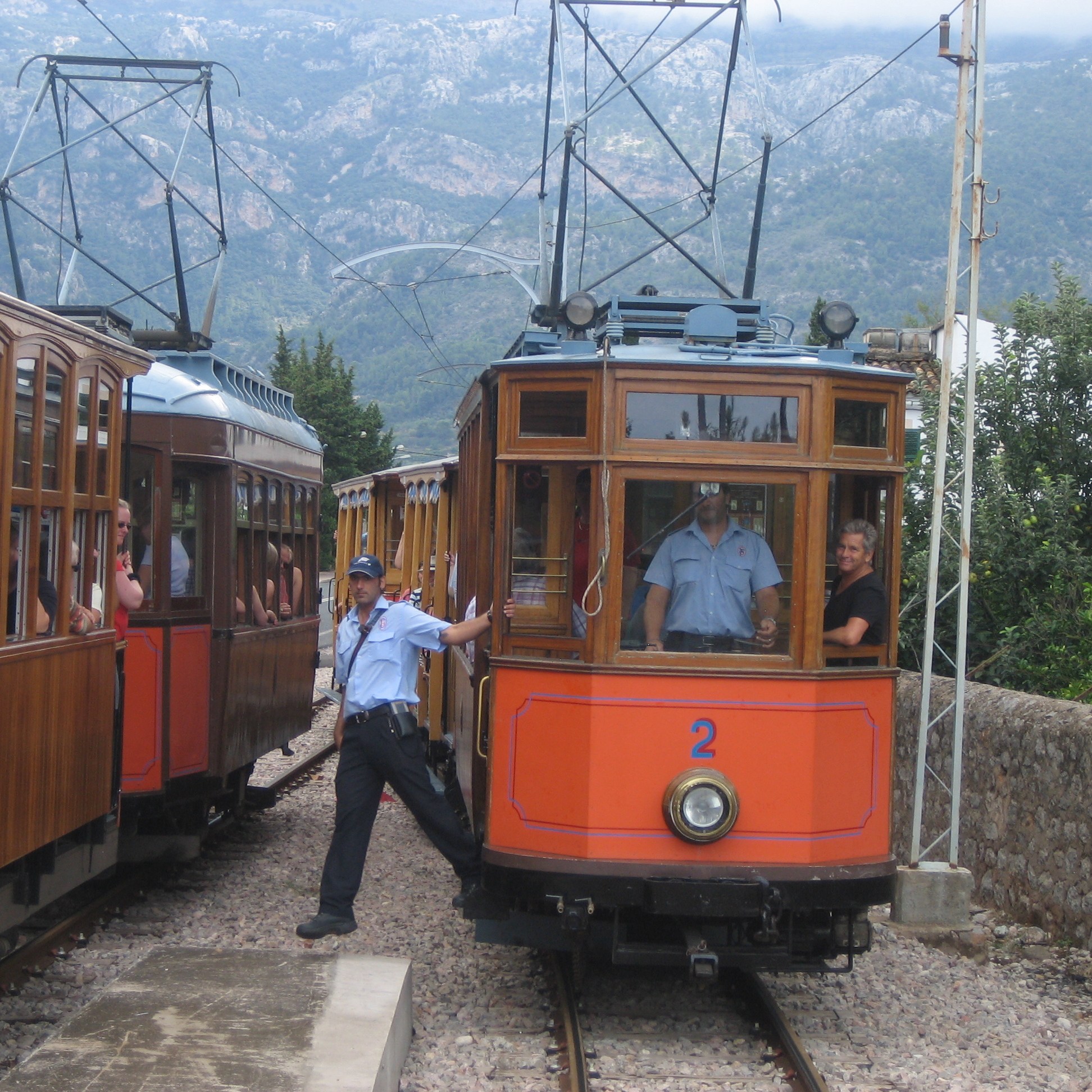 Also weiter warten, eine halbe Stunde verging, der nächste Bus kam. Das gleiche Schauspiel. Diesmal half alles nichts. Wenn wir die Soller-Bahn noch erwischen wollten, mussten wir da rein. Atem anhalten, Bauch einziehen und reingequetscht. Jetzt weiss ich, wie sich eine Sardine fühlt. Wir hatten ausgerechnet den langsameren Bus der beiden Linien nach Palma erwischt. Der bummelte gemütlich vor sich hin und hielt an jedem Hühnerhaufen. Ich wäre jede Wette eingegangen, dass wir das zeitlich nicht mehr schaffen. Genau 5 Minuten vor Abfahrt des Zuges kamen wir in Palma in einer Art unterirdischem Bushof an. Tatsächlich haben wir es fertig gebracht, in diesen paar Minuten wieder ans Tageslicht zu kommen, uns zu erkundigen, wo der Zug denn abfährt und um die nächste Ecke zu rennen, wo der ‚Rote Blitz‘ abfahrbereit stand. Der nette Schaffner wartete, bis wir unsere Fahrkarten hatten und dann ging es auch schon los.