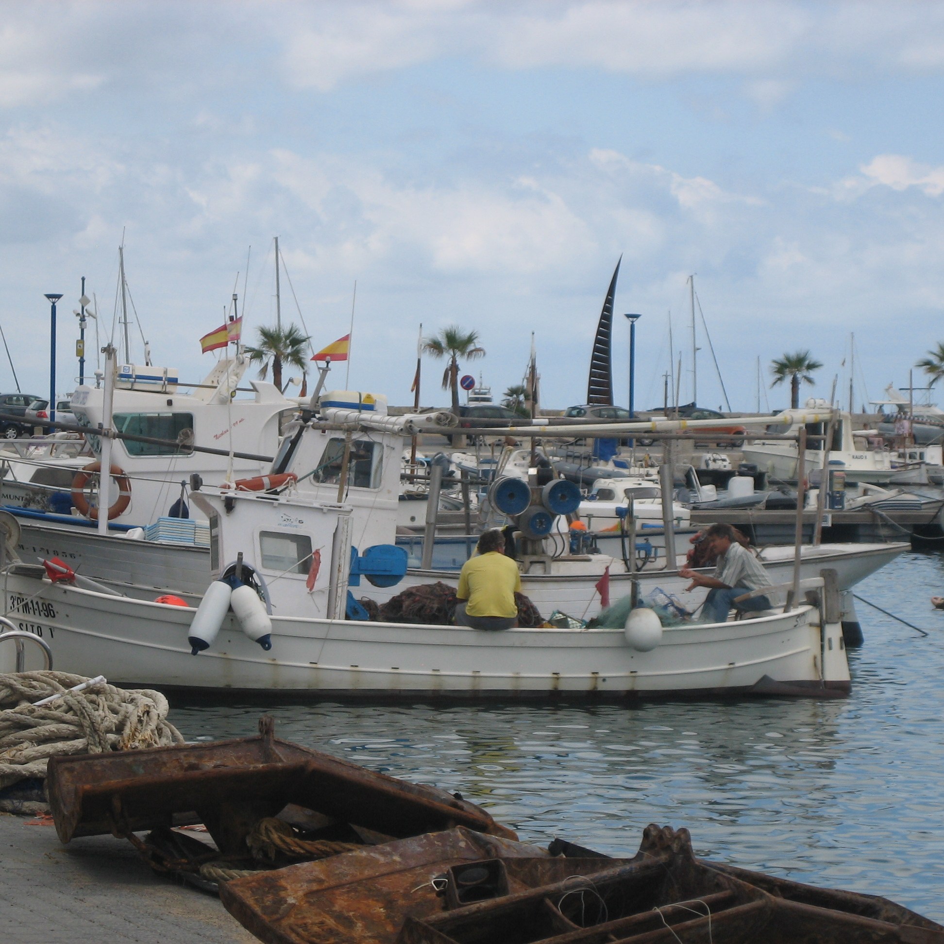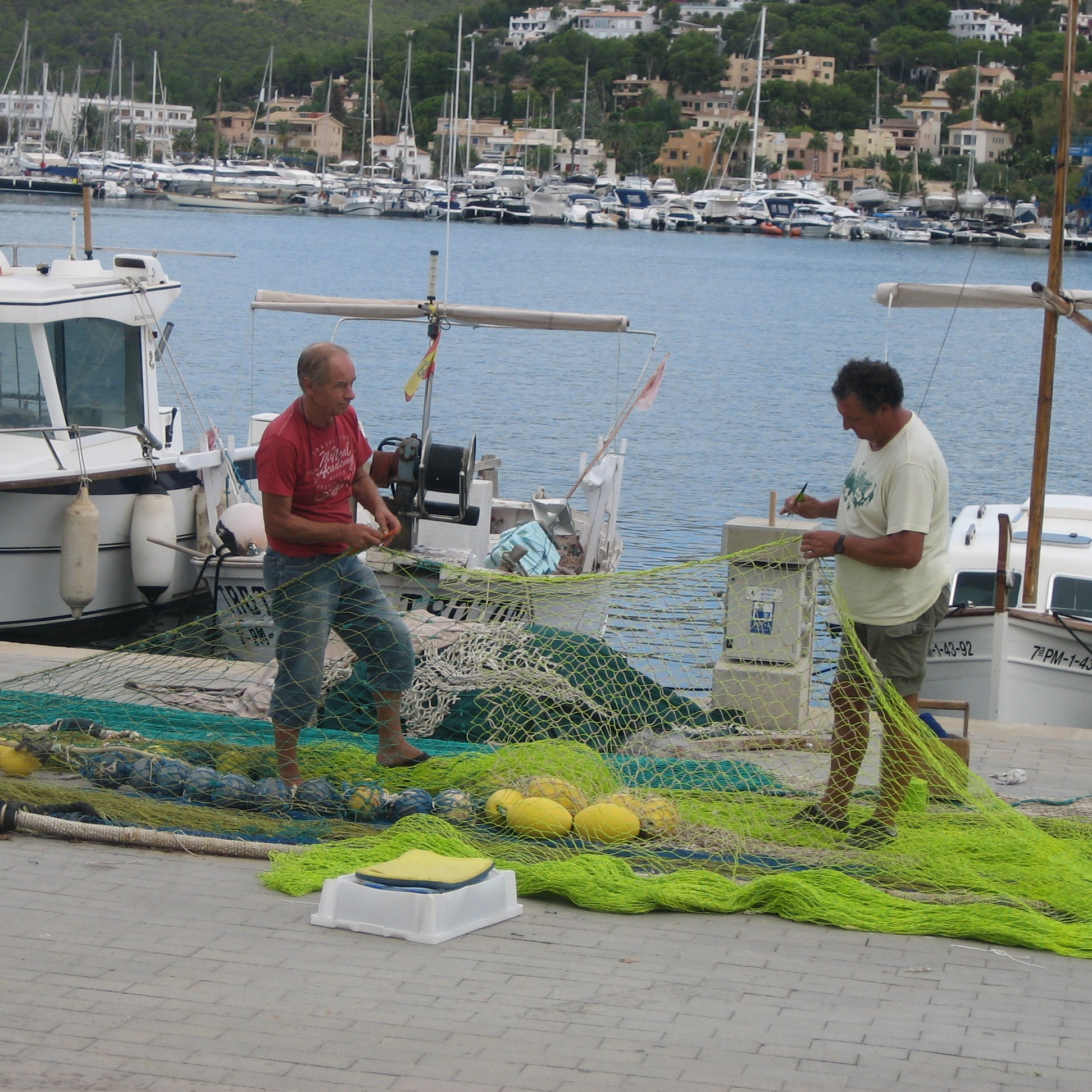 Am nächsten Tag überlegten wir nach einem wie immer ausgiebigen Frühstück, an die Cala Ratjada zu fahren. Das bedeutete, einmal quer über die Insel in den Nordosten von Mallorca. Bis Manacor gibt es eine Autobahn, aber auch die Landstrassen sind ganz wunderbar ausgebaut. Ein kurzer Anruf … und wir machten den Ausflug zu viert. Der Hafen von Cala Ratjada ist offenbar der zweitgrösste Fischerhafen nach Palma. An der Promenade kann man wunderbar sitzen, die Sonne geniessen und das Treiben im Hafen beobachten. War interessant, was man da sah. Zum Beispiel einen Charter-Segler mit jeder Menge Besatzung an Bord, von denen – das war leider offensichtlich – jeder soviel Ahnung vom Anlegen hatte wie ein Fisch vom Surfen. Verzweifelt bemühte sich die Mannschaft, das grosse Schiff in einer Box unter zu bringen. Mal lag es backbord quer davor, mal steuerbord. Alle Besitzer der Nachbarboote befanden sich in Alarmstellung an Bord und leisteten Hilfe, wahrscheinlich weil sie um ihre eigenen Boote fürchteten. Und das mit Recht. Aber als Zuschauer hat man leicht Reden … böseböse