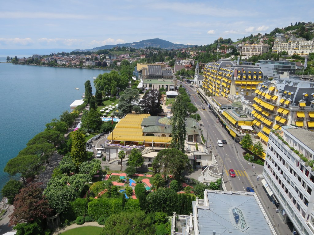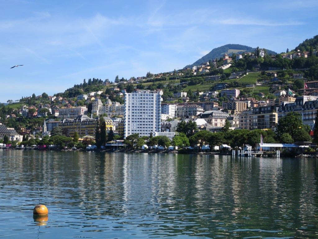 Dann ging es mit der Seilbahn wieder hinunter. Ich nahm den nächsten Bus bis Montreux Casino und schlenderte die Uferpromenade entlang zurück zum Eurohotel. Mein Mann erwartete mich dort auf der Terrasse, bevor für ihn der musikalische Arbeitsabend anfing. Ich versprach, am Abend noch kurz im Nachbarhotel vorbei zu schauen. Vielleicht konnten wir in einer Pause noch etwas miteinander trinken.