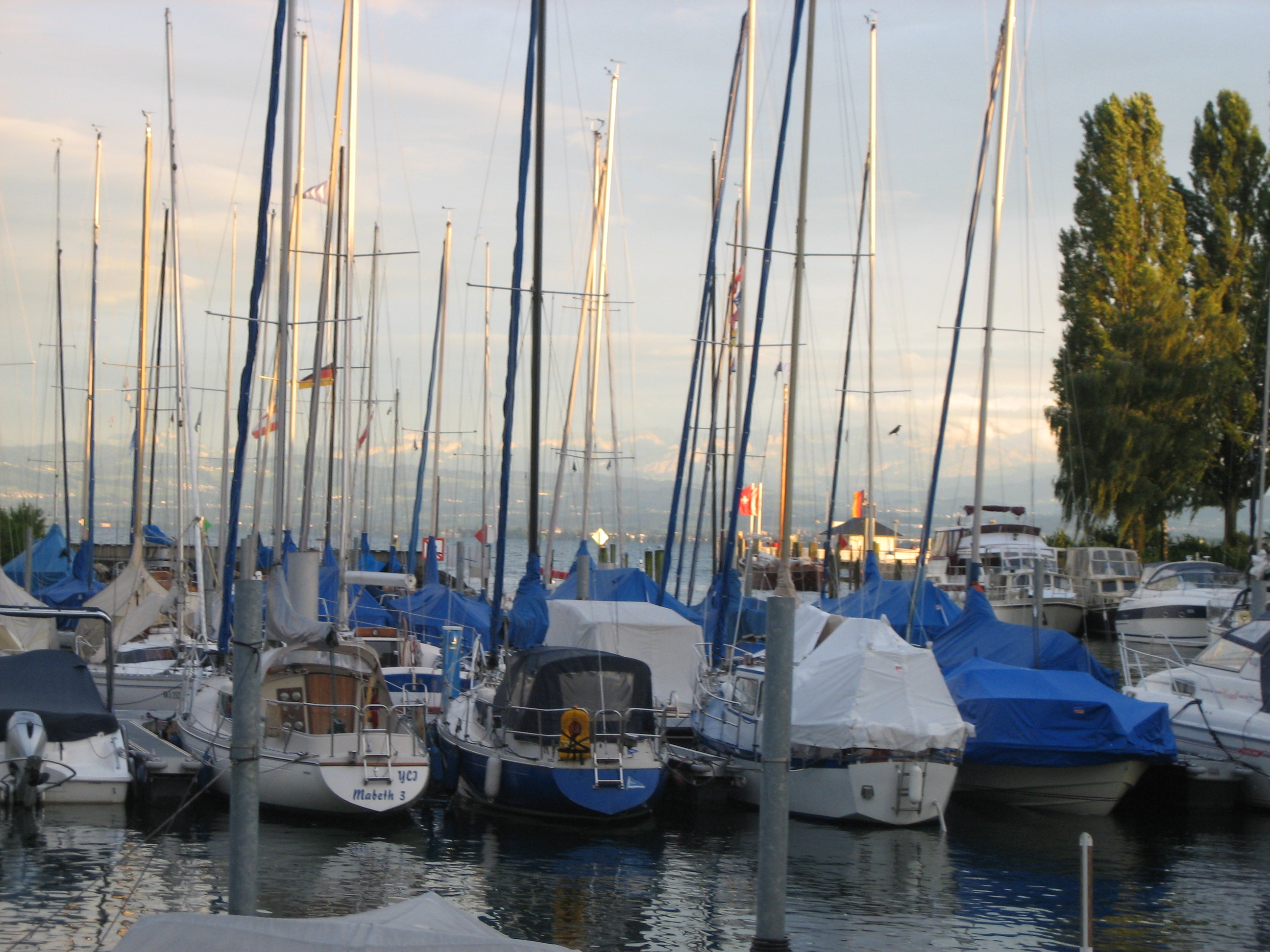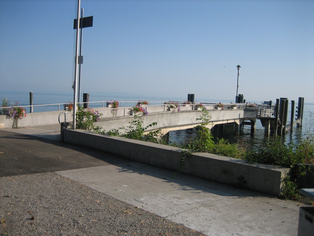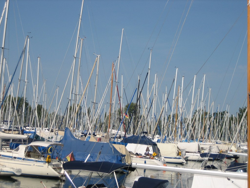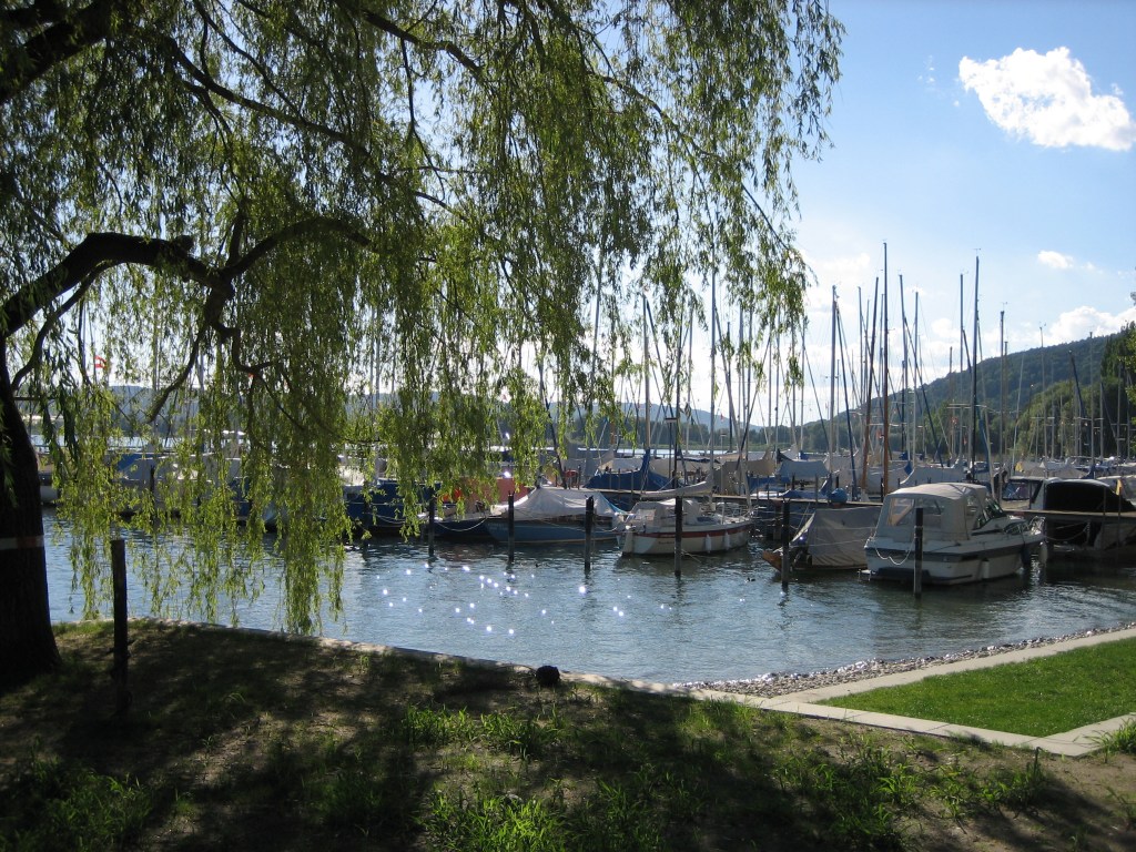 Hoffentlich würden wir dort einen Platz bekommen. Es wurde immer später und die Wolken immer dicker. Und es waren doch auch immerhin noch 8 Kilometer, die wir zu motoren hatten. Als wir in Immenstaad ankamen, hatte ich für diesen Tag die Nase voll. Von der Sonne, vom See … und überhaupt. Wenn wir jetzt hier auch nicht bleiben konnten – ja, was dann. Bei der Einfahrt in den Hafen sahen wir die Schiffe schon im Päckchen an der Mauer liegen. Ojeoje. Hier sah es auch nicht besser aus als in Friedrichshafen. Aber der Hafenmeister rief uns vom Ufer aus zu, wir sollen unter dem grossen Weidenbaum anlegen. Da lag zwar schon jemand, aber der würde in einer Stunde wieder wegfahren. OK, besser als nichts. Steuerbord machten wir uns an diesem Schiff fest …schwitz schwitz … und beäugten misstrauisch die Steinplatte unter uns. Zwischen dieser und dem Schiff hatte es nur noch beängstigend wenig Platz. Deshalb konnten wir auch nicht näher ans Ufer, was das Absteigen vom Schiff nicht einfacher machte.