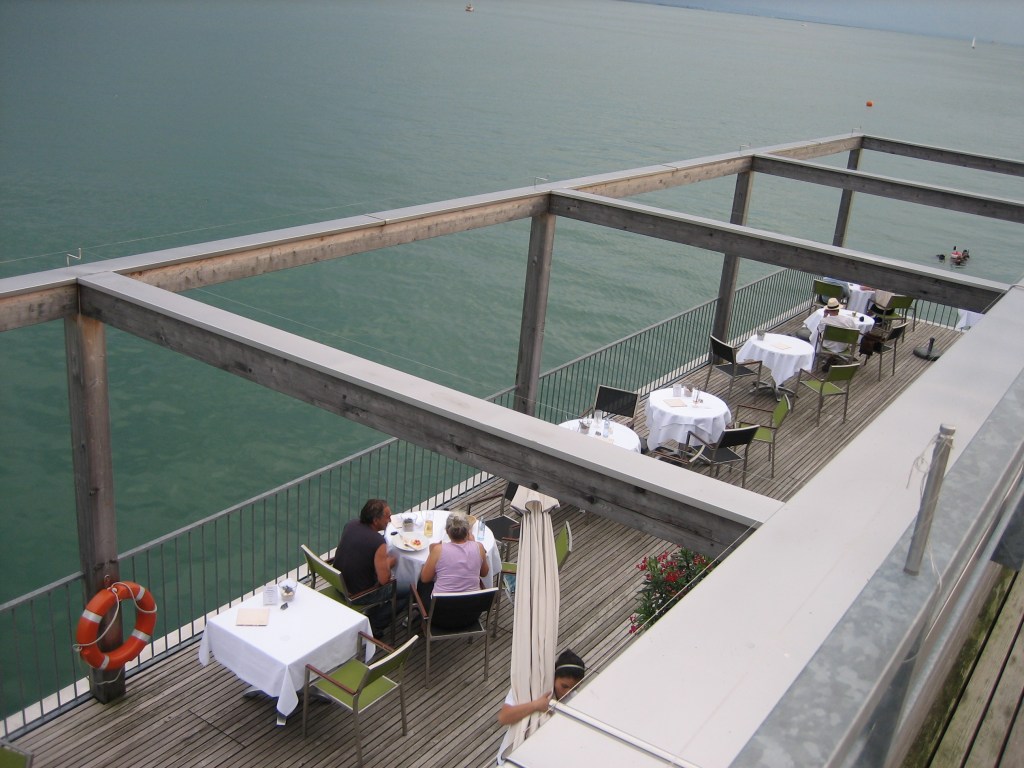 An diesem Abend gönnten wir uns etwas besonderes, ein Abendessen im Gartenrestaurant Giardino des Hotels Bad Horn, ein wunderschönes ‚Nautikhotel‘ direkt am See. Zum Hotel gehört auch die ‚Emily‘, eine exclusive Motoryacht im Stil der Dreissigerjahre, die man für Ausflüge und Veranstaltungen mieten kann. Leider lag sie an diesem Abend nicht vor Anker, vielleicht war sie zu den Bregenzer Festspielen unterwegs. Da wir im Giardino keinen Tisch reserviert hatten, erhielten wir nicht gerade den besten Platz – das Restaurant war voll ausgebucht – , aber das Essen war hervorragend.