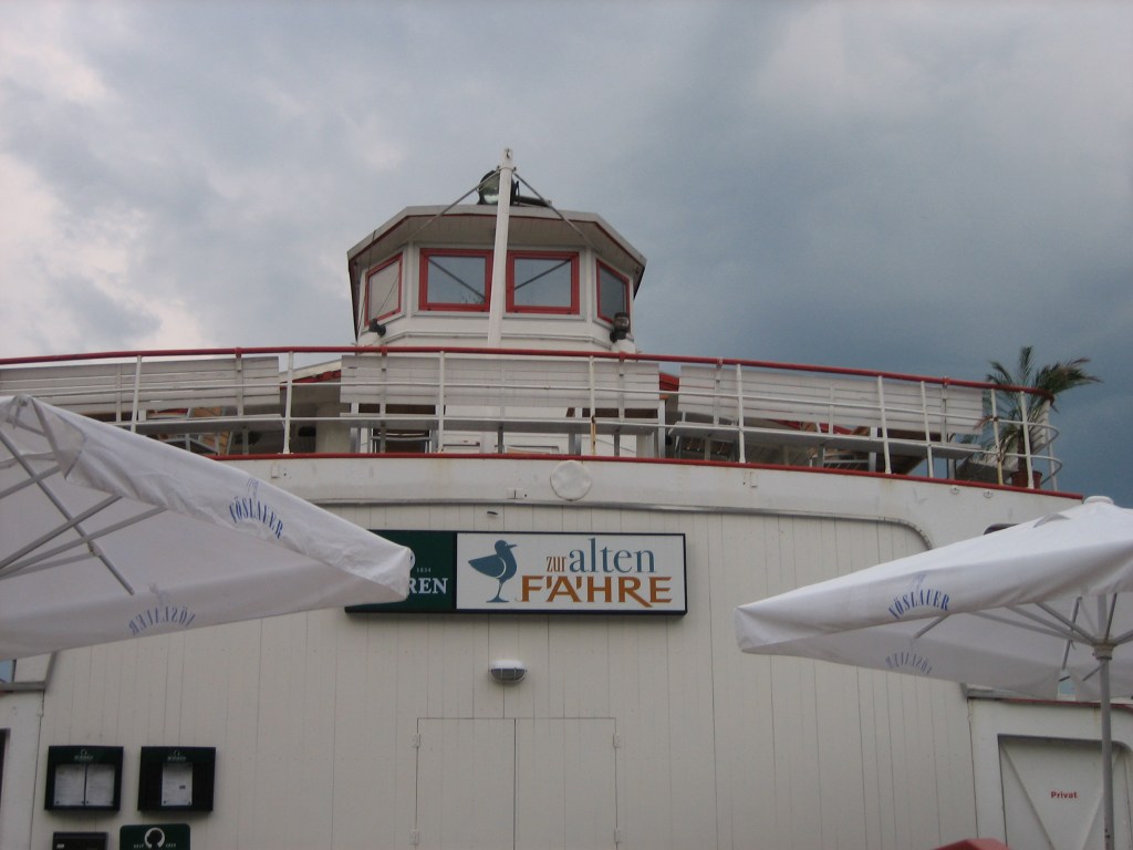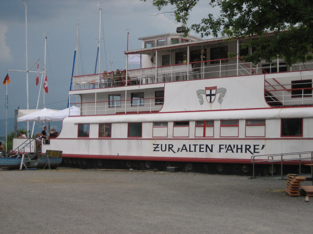 In diesem Hafen läd das Restaurant Rheinspitz mit seiner schönen Aussichtsterrasse zum Essen ein. Aber die Preise sind gesalzen. Apropos Restaurant …….ich ging schon mal vor – mein Mann wollte nachkommen – und sah, dass die besten Plätze im vorderen Teil der Terrasse leider schon besetzt waren. Aber ich entdeckte *freu* im hinteren Teil noch einen freien Tisch. Dieser Teil war vom vorderen mit einem grossen Blumenkübel abgetrennt, so dass ich dorthin nur durch das Restaurant kam. Also, rein ins Restaurant und auf der anderen Seite wieder auf die Terrasse. Super, die letzten Plätze ergattert. Winkend machte ich meinen Mann auf mich aufmerksam. Der kam dann auch und … fischte mich aus der Trauergesellschaft. Der Blumenkübel stand nicht umsonst als Abtrennung da und den ’so was ähnliches wie ein Altar‘ im Restaurant hatte ich nicht gesehen. Ups, peinlich. Gut, die Leute hatten schon ein bisschen komisch geguckt, aber das viel mir erst im Nachhinein auf. Aber mal unter uns … sooo traurig sahen die jetzt auch nicht aus.