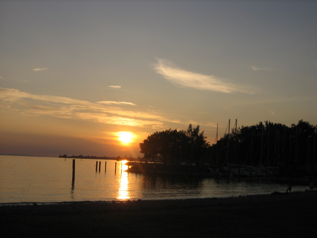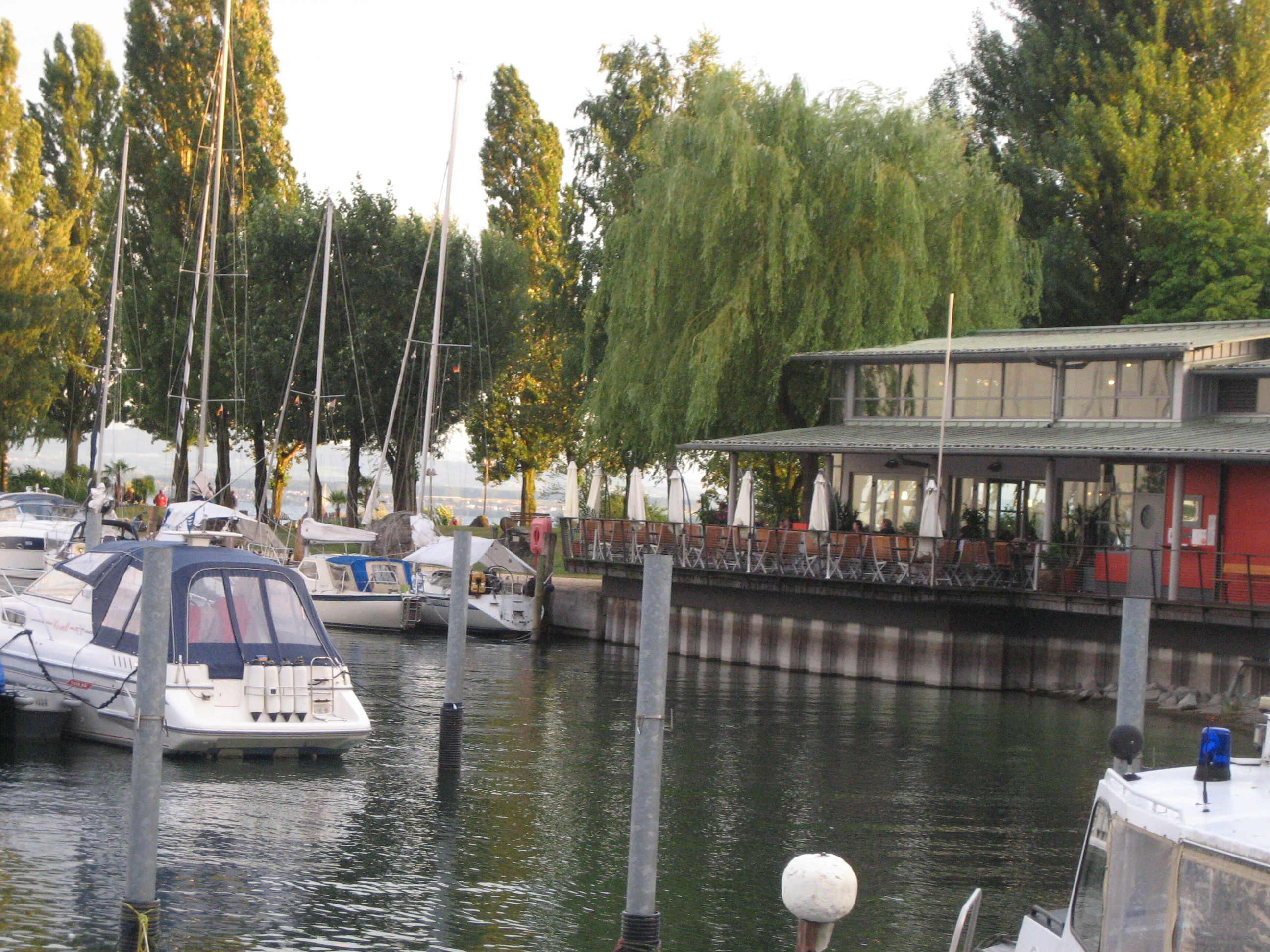 Aber zurück nach Langenargen. Am Abend freute ich mich auf mein Standard-Abendessen im Restaurant Fischerhütte, Kartoffelpuffer. Die mag ich selbst bei mehr als 30 Grad ;-). Aber Pustekuchen … der Pächter des Restaurants hatte gewechselt und somit auch die Karte. Also keine Kartoffelpuffer. Dafür habe ich festgestellt, dass Mücken eine gute Hilfe beim Abnehmen wären… man schlägt den halben Abend verzweifelt um sich, bis das Essen kalt ist und man es eh nicht mehr mag. Die Mücken waren eine echte Plage an diesem Abend und das Anti-Brumm hatten wir natürlich auf dem Schiff vergessen. Wenn das jetzt in jedem Hafen so wäre… das konnte ja heiter werden. Den Espresso nahmen wir dann lieber ein Haus weiter, dort war es mit den Viechern nicht ganz so schlimm.