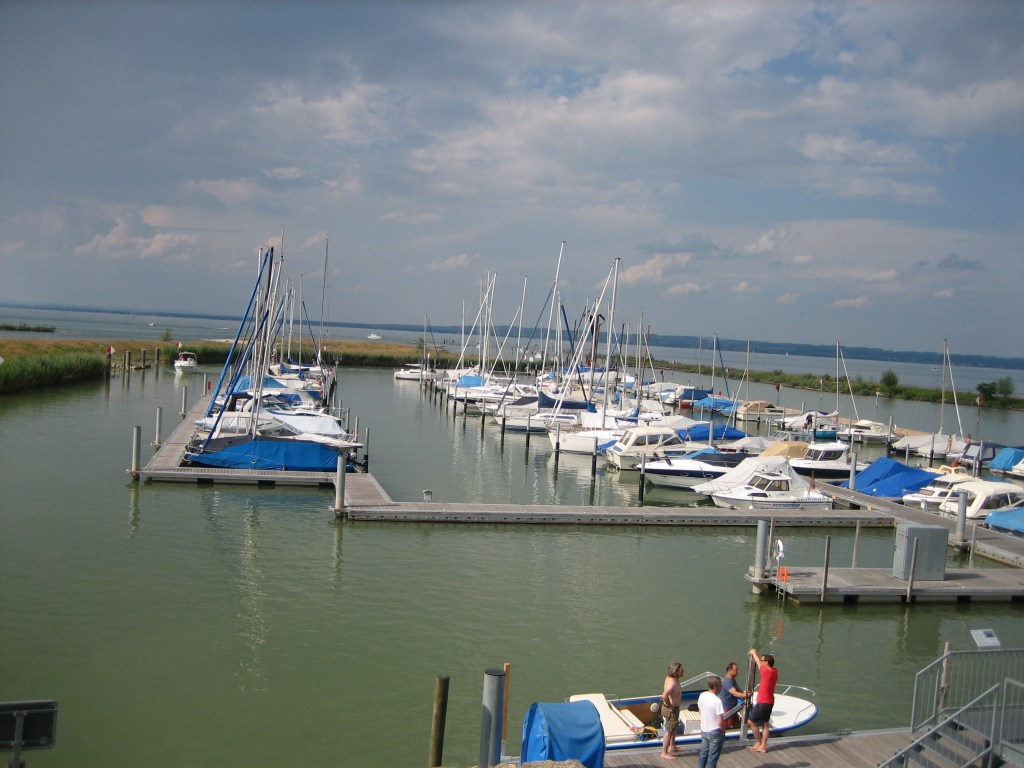 Für diesen Tag war viel Wind und Gewitter angesagt und wir beschlossen, ins österreichische Lochau zu segeln, was eine ganz schöne Strecke ist. Also am späten Vormittag raus aus dem Hafen, Segel gesetzt und gehofft, dass der Wind bis Lochau so gut bleibt. Grosse dunkle Gewitterwolken verfolgten uns, aber – noch – tat sich nichts. Wir kamen sehr gut vorwärts und kurz vor unserem Ziel machten wir noch einen Badestopp. Die schwüle Hitze an diesem Tag war kaum auszuhalten. Der Hafen war ziemlich gut belegt, aber der Hafenmeister gab uns doch noch einen schönen Platz nah bei der alten Fähre, in der ein Restaurant untergebracht ist.