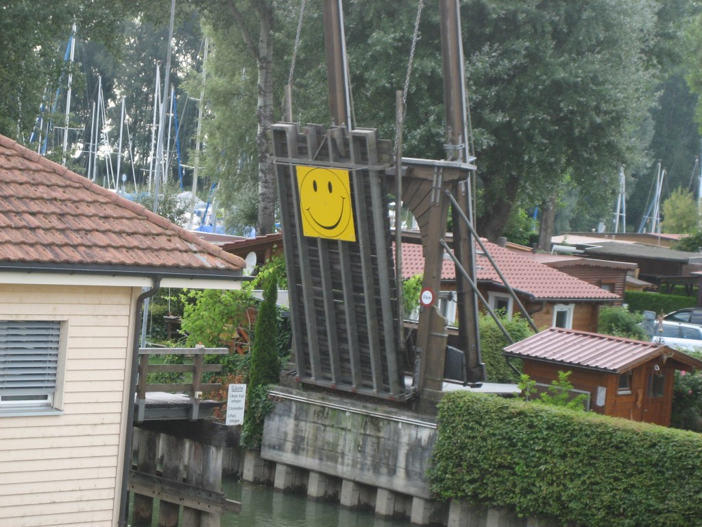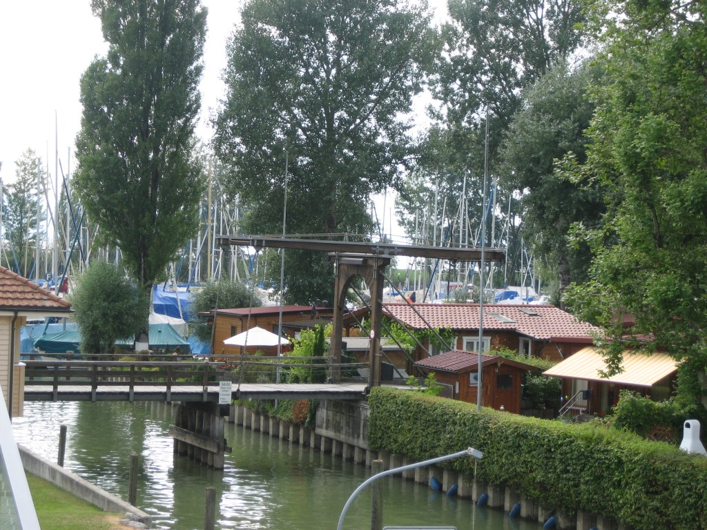 Wir passierten die lange Zufahrt in den Hafen, der eigentlich aus zwei verschiedenen Häfen besteht. Der ‚Marina Rheinhof‘ und dem relativ neuen Aussenhafen ‚Rheinspitz‘. Für die Einfahrt in den hinteren Teil des Hafens wird jedesmal eine schöne alte Zugbrücke hochgezogen. Sein Kommen kündigt jeder Skipper mit einem lauten Tuten an.