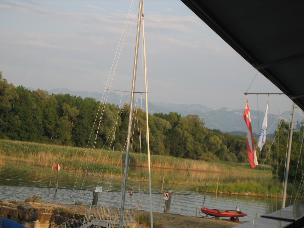 Wenn man von Altenrhein spricht, weiss jeder Segler, welcher Hafen gemeint ist. Dieser Schweizer Hafen war unser nächstes Ziel. Es war bewölkt, aber schon wieder sehr heiss und es ging ein wunderbarer Wind, so dass wir ohne Motor ans Ziel kommen würden. Irgendwo auf dem See trafen wir ein älteres Ehepaar mit dem gleichen Boot, welches wir segeln. Da diese auf dem See nicht so weit verbreitet sind, war das natürlich ein willkommener Anlass zu einem Plausch auf dem See.