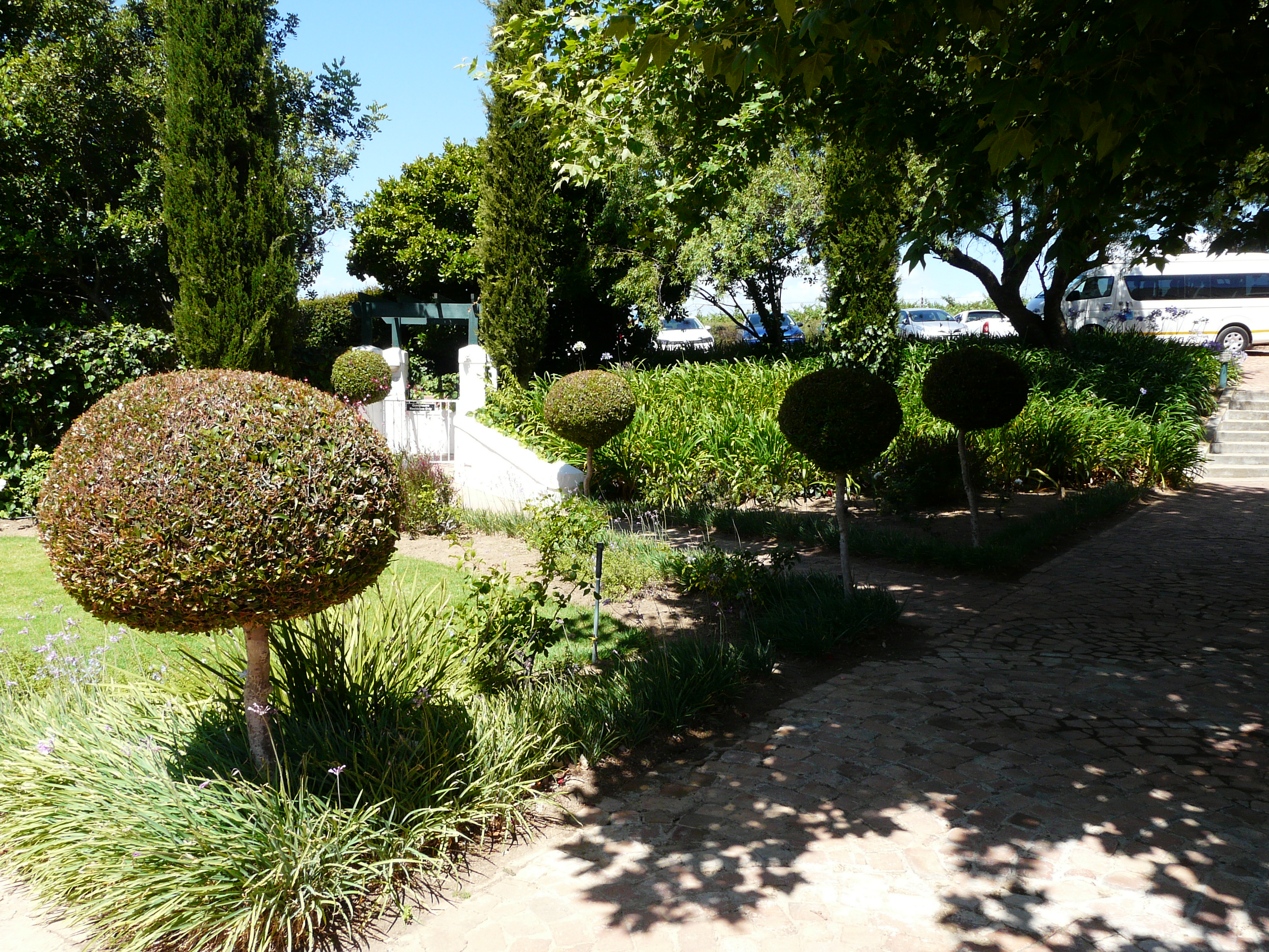 Um 13:30 Uhr wurden wir von einem Bus der African Eagle Agentur am Hotel abgeholt für die bereits daheim gebuchte Tour in die Winelands. Der Fahrer war pünktlich da. Es gab nur ein gaaanz kurzes Palaver, ob wir die Tour tatsächlich schon daheim bezahlt hätten. Alles klar, konnte losgehen. Wir sammelten an verschiedenen Hotels noch andere Urlauber ein und waren schlussendlich zu acht. Dabei auch ein Paar aus Thailand, dessen ca. 10-jähriger Sohn seinen Unmut über die für ihn natürlich nicht sehr interessante Tour kund tat. Laut vor allen Dingen. Und jedesmal, wenn er den Mund aufmachte, stopfte ihm die Mama irgendwas Süsses rein, so dass er wieder eine zeitlang beschäftigt war. Der arme kleine Kerl sah leider selbst aus wie ein Marshmallow und ich habe ihn sehr bedauert.