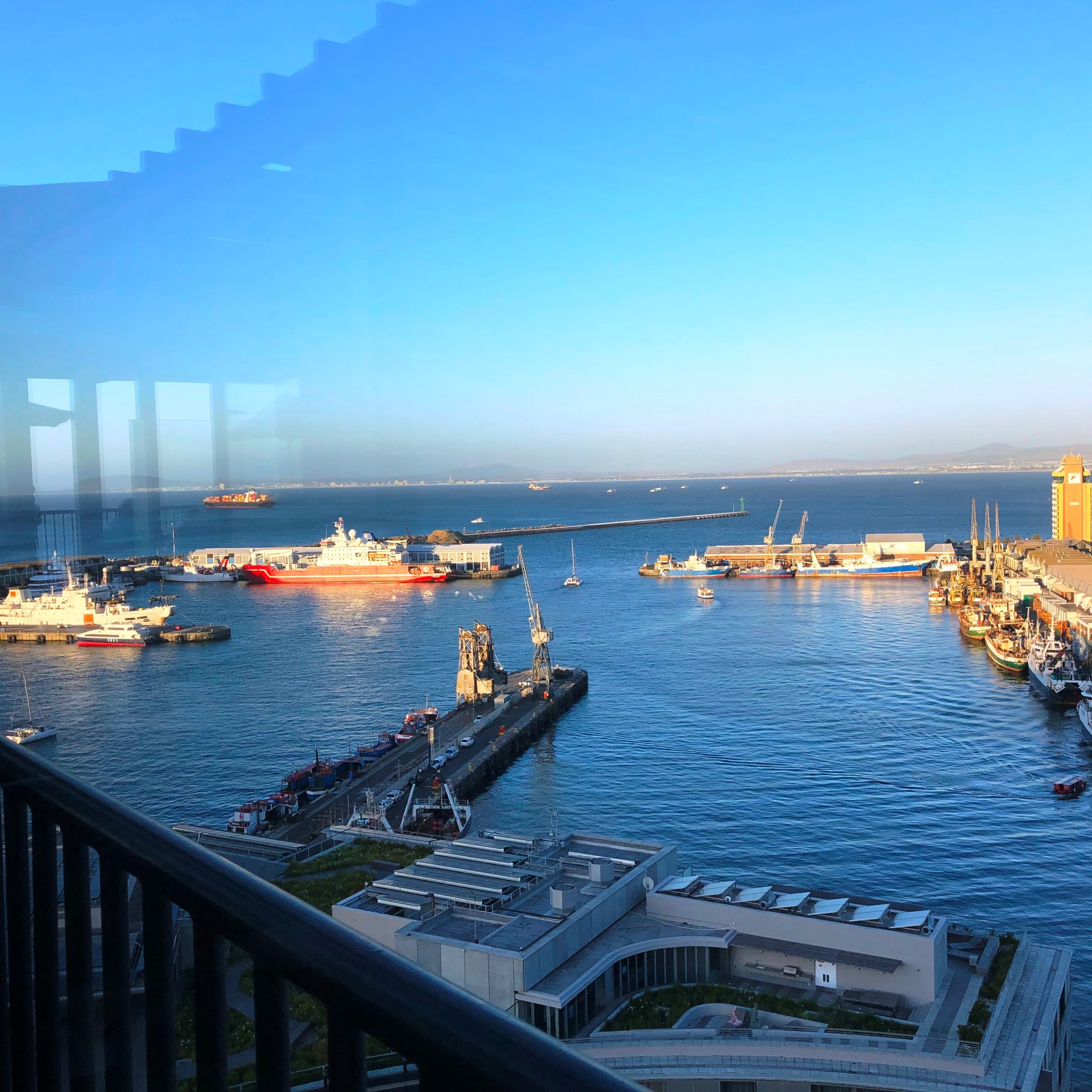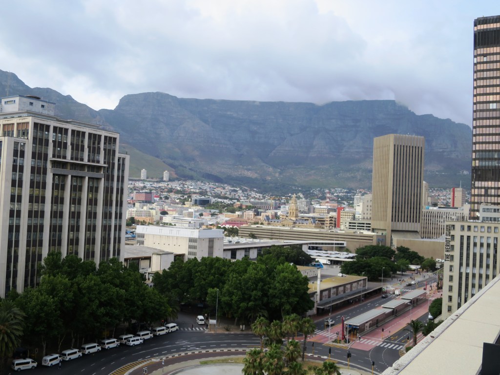 Gemütlich bummelten wir zurück zum Hotel. Unser Zimmer war jetzt bezugsfertig. Es war im 6. Stock mit Blick auf den Tafelberg, geräumig und sauber. Das Badezimmer war allerdings … gewöhnungsbedürftig. Es war ein in sich nicht abgeschlossener Raum mit 2 ‚Kabinen‘ nebeneinander, Dusche und WC, die Türen nach oben offen. Schon mal was von Privatsphäre gehört? Noch ein paar Worte zum Hotel: die Lage war sehr zentral in einem Geschäftsviertel, WLAN funktionierte im ganzen Hotel einwandfrei, das Frühstück war hervorragend. Eine sehr gute Empfehlung vom Freund meines Mannes. Danke dafür 🙂