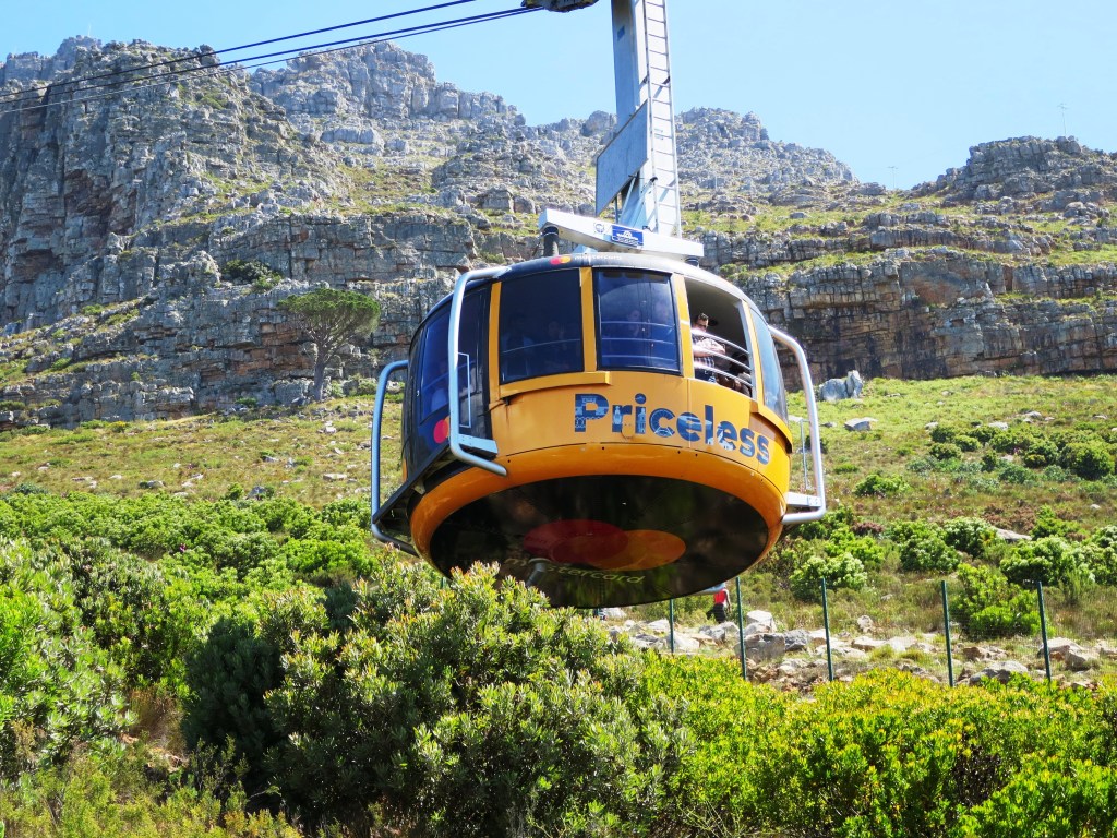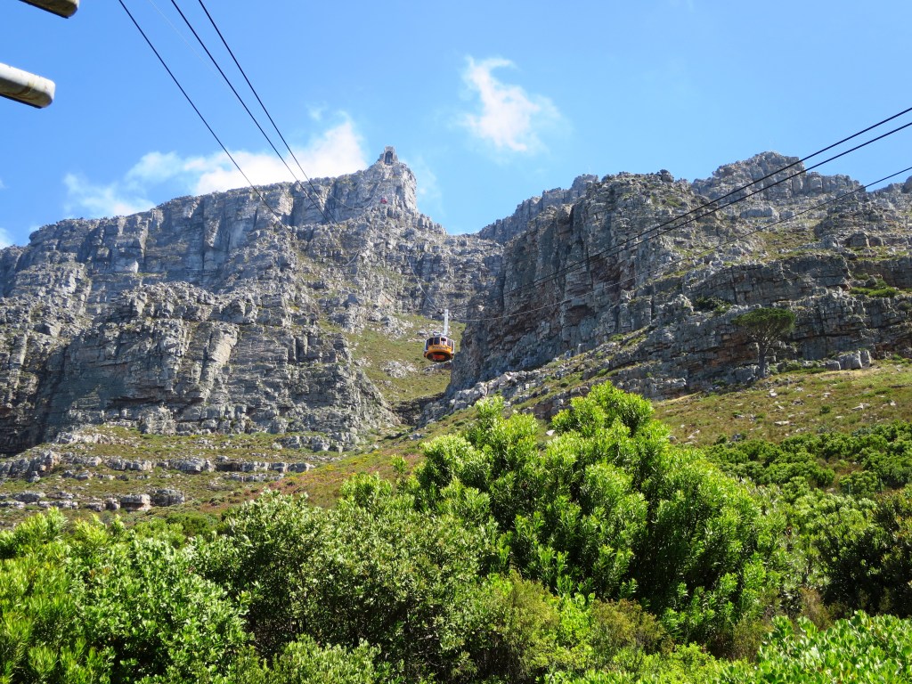 Ich war wahnsinnig froh, dass ich wenigstens einen dicken Pulli und einen Schal dabei hatte. Ich hätte mehr gebrauchen können. Endlich hatten wir unsere Tickets … auf in die nächste Warteschlange vor den Aufzügen, die uns eine Etage höher brachten, wo wir uns zu zahlreichen Menschen gesellten, die ebenfalls auf die Gondelbahn warteten. Irgendwann hatten wir es geschafft. Die Seilbahn überwand ca. 700 Höhenmeter und wir waren oben. Hatte ich erwähnt, dass unten ein kalter Wind ging? Auf dem Tafelberg war dieser noch um einiges schlimmer. Also, Tipp an zukünftige Besucher: warm anziehen oder zumindest warme Kleidung mitnehmen.