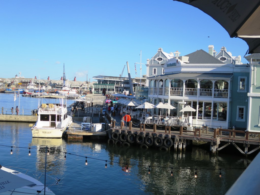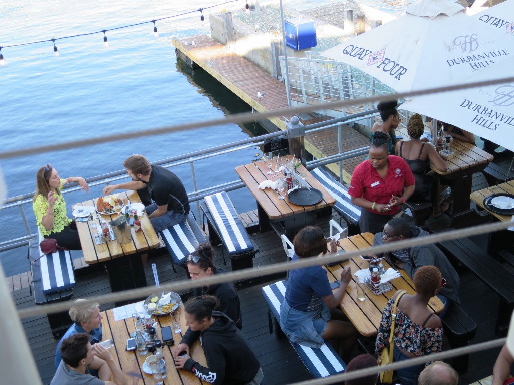 An der Waterfront empfing uns ein buntes Treiben mit einer Mischung aus Touristen, Einheimischen, Musik und den verschiedensten Düften. Zeit also, ein Plätzchen für’s Abendessen zu suchen, das wir im ‚Quay four‘ fanden. Das Quay ist eines der ältesten Restaurants Kapstadts, der Besuch schon fast ein ‚must‘. Von hier aus den Sonnenuntergang betrachten … einfach nur phantastisch. Das Essen (Lachsfilet) war hervorragend und für unsere Verhältnisse recht günstig. Mein Wein war ein ‚Durbanville‘, seeehr empfehlenswert. Von der Terrasse aus konnte man viele Ausflugsboote beobachten, die die Touristen in fröhlicher Stimmung und mit viel Musik in den Sonnenuntergang fuhren.