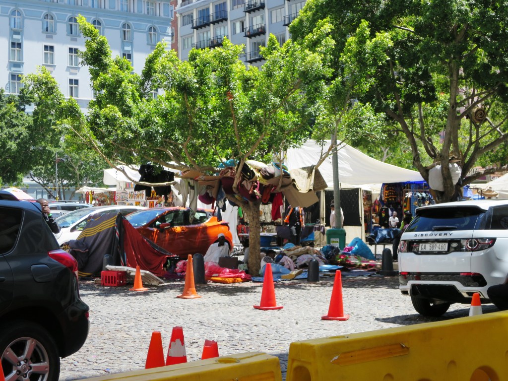 Aber auch dies gibt es. Menschen, die am Rande des Green Market Square ihr Nachtlager aufschlagen oder auf den Treppen der Gebäude schlafen, inklusive richtiger Matratze.