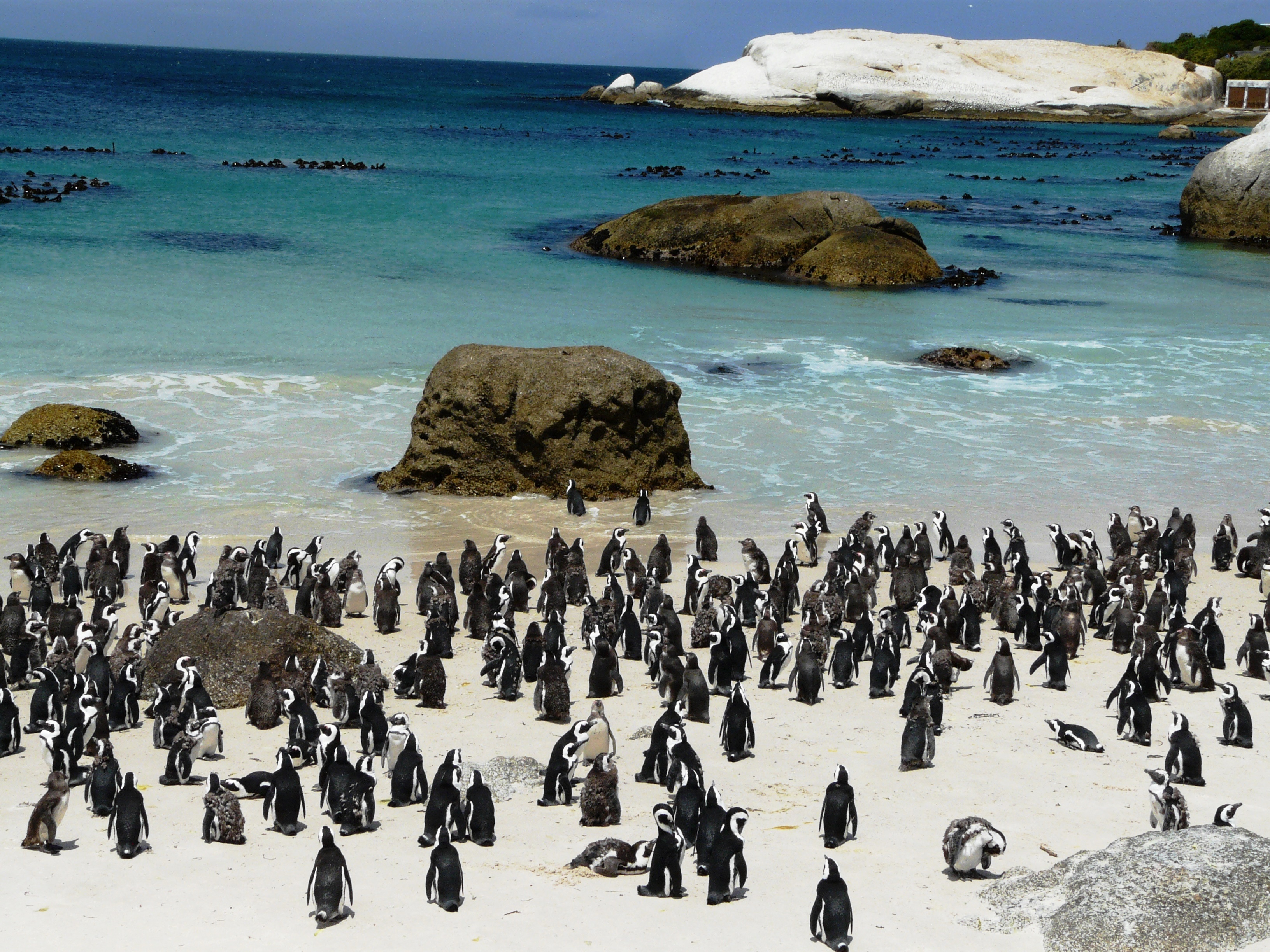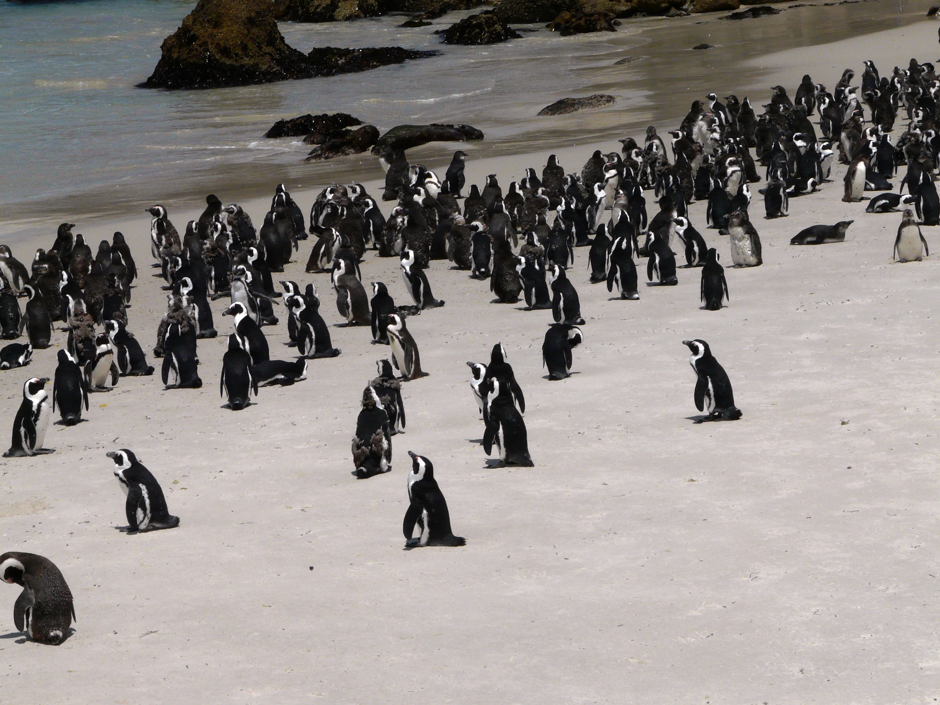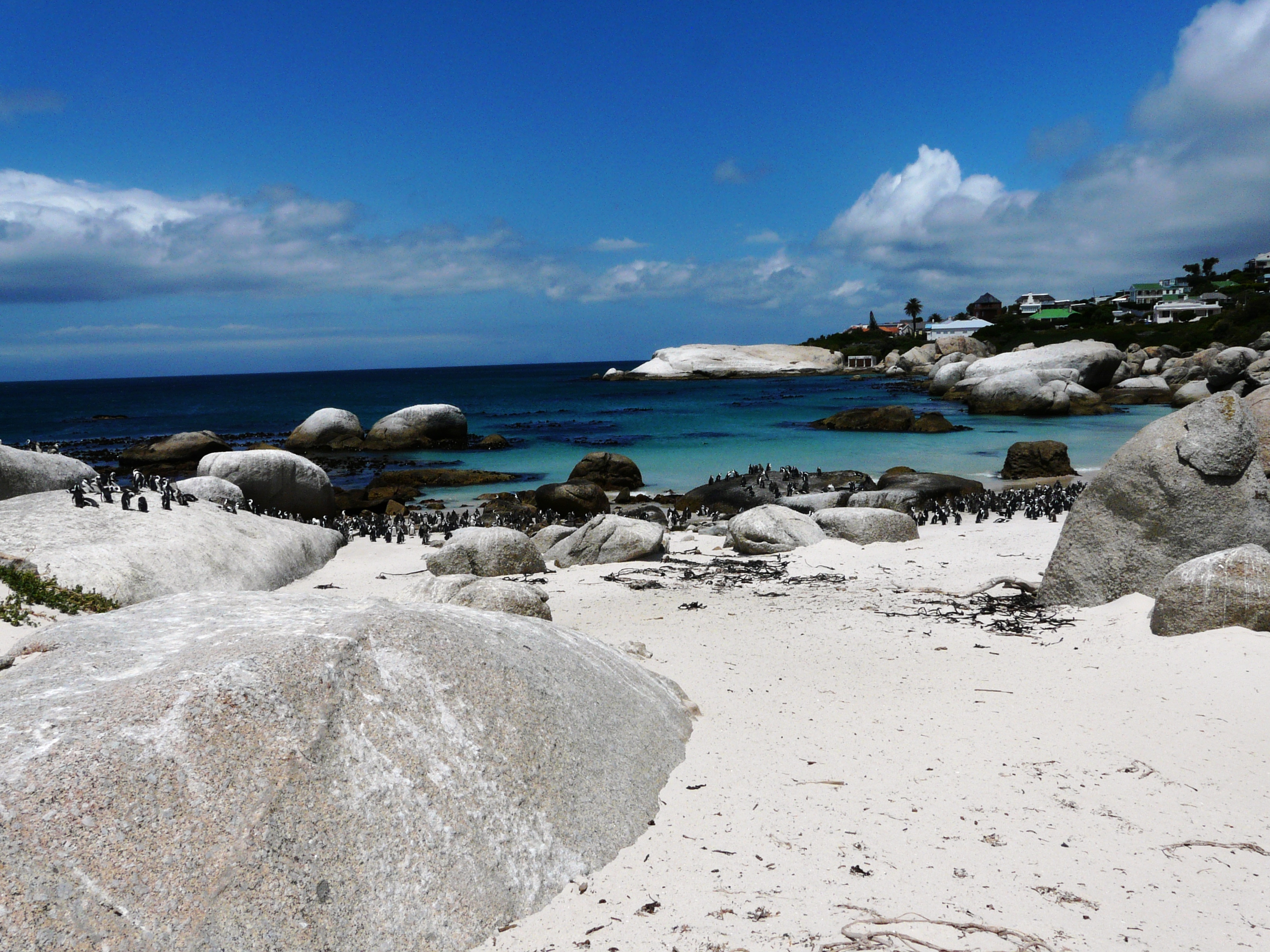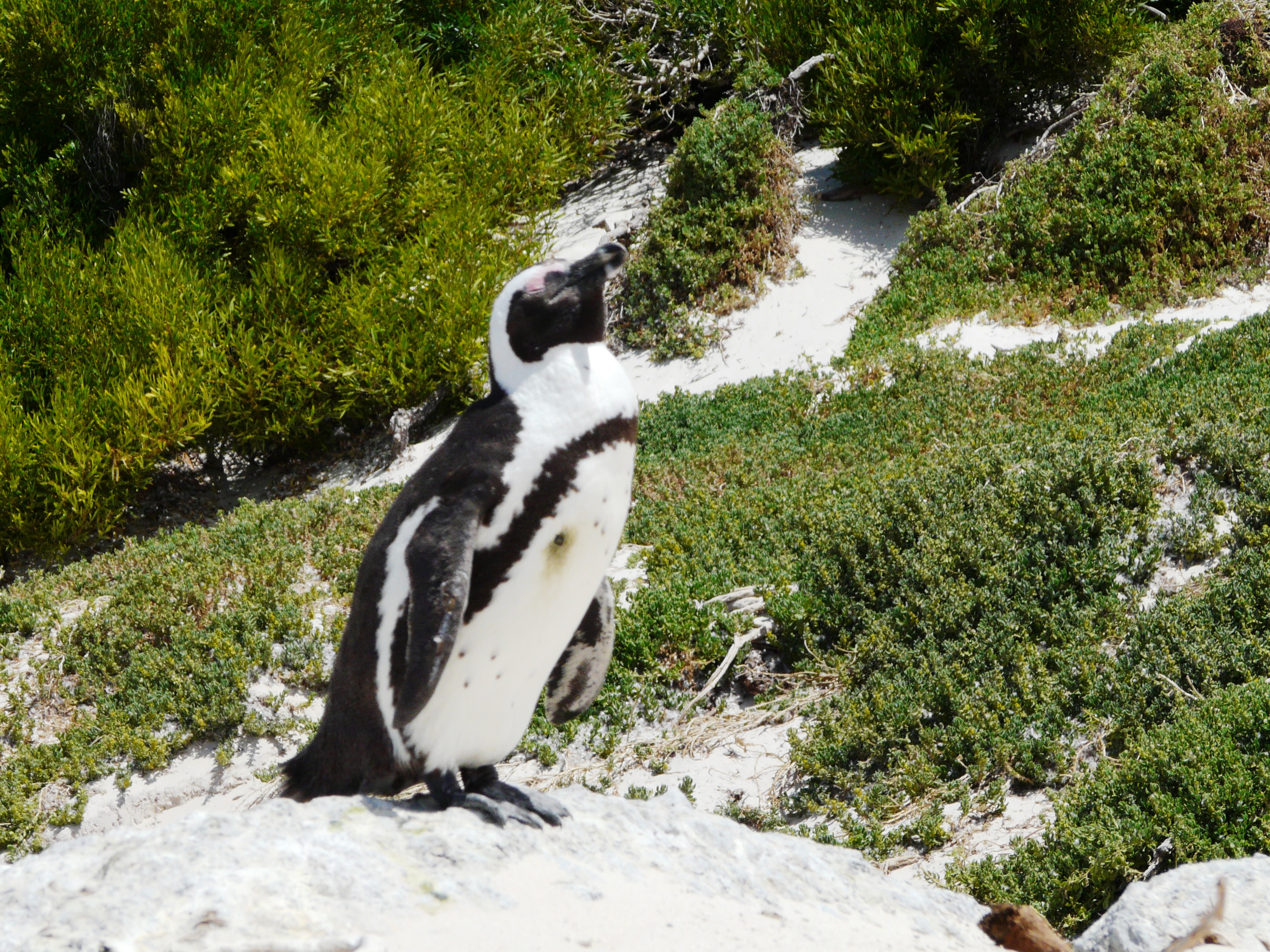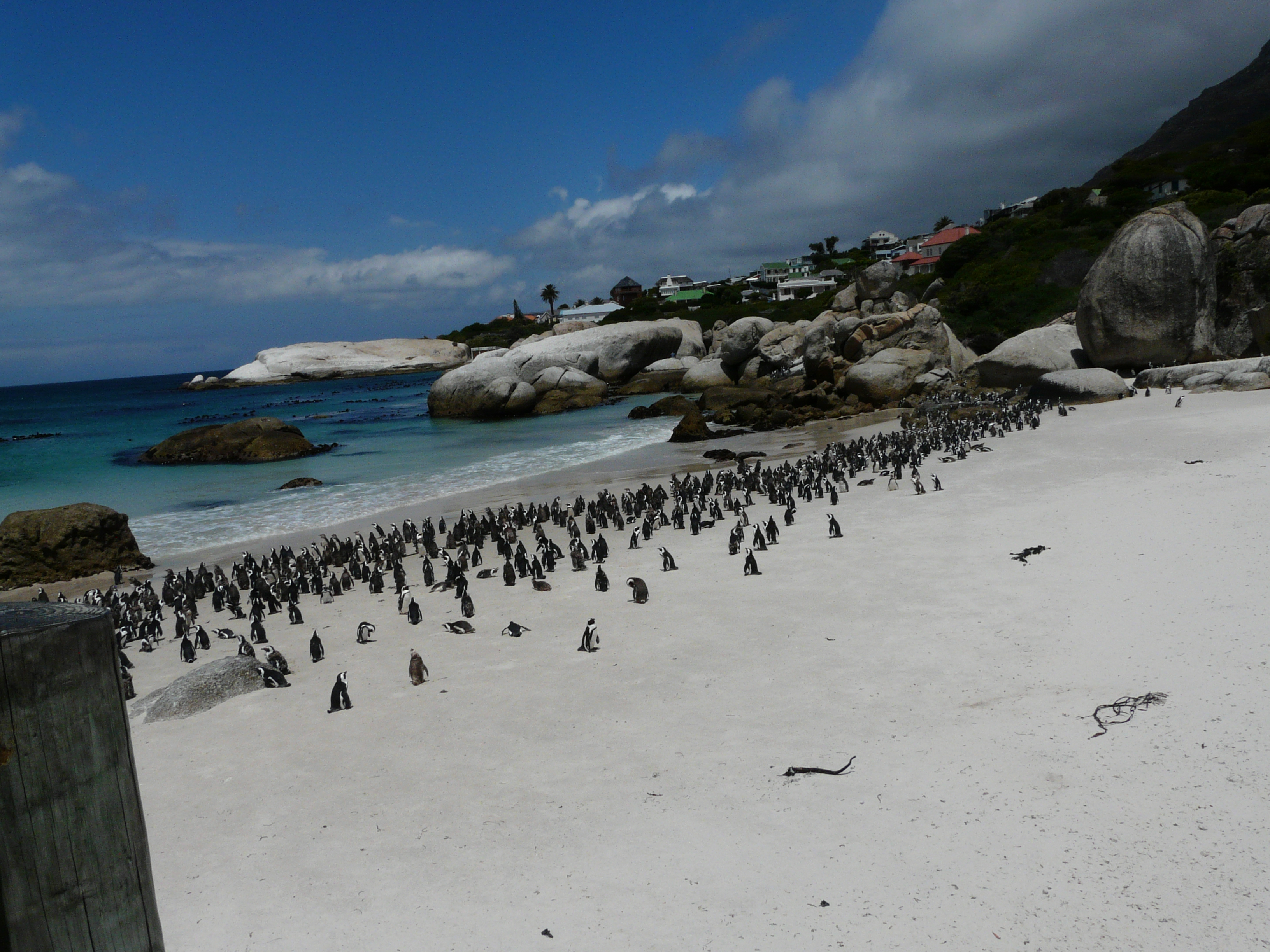 Weiter ging unsere Tour zum Boulders Beach in Simon’s Town, um die berühmte Kolonie der Brillenpinguine zu besuchen. Zwei schöne Holzstege führen zum Strand, wo man das Treiben der Tiere beobachten kann. Es scheint, dass die neugierigen Pinguine sich den dortigen Lebensbedingungen gut angepasst haben. Sie können sich in den Büschen am Strand verstecken, wenn sie ihre Ruhe haben wollen. Ihre Nester mit den Küken verstecken sie in Kuhlen im Sand.