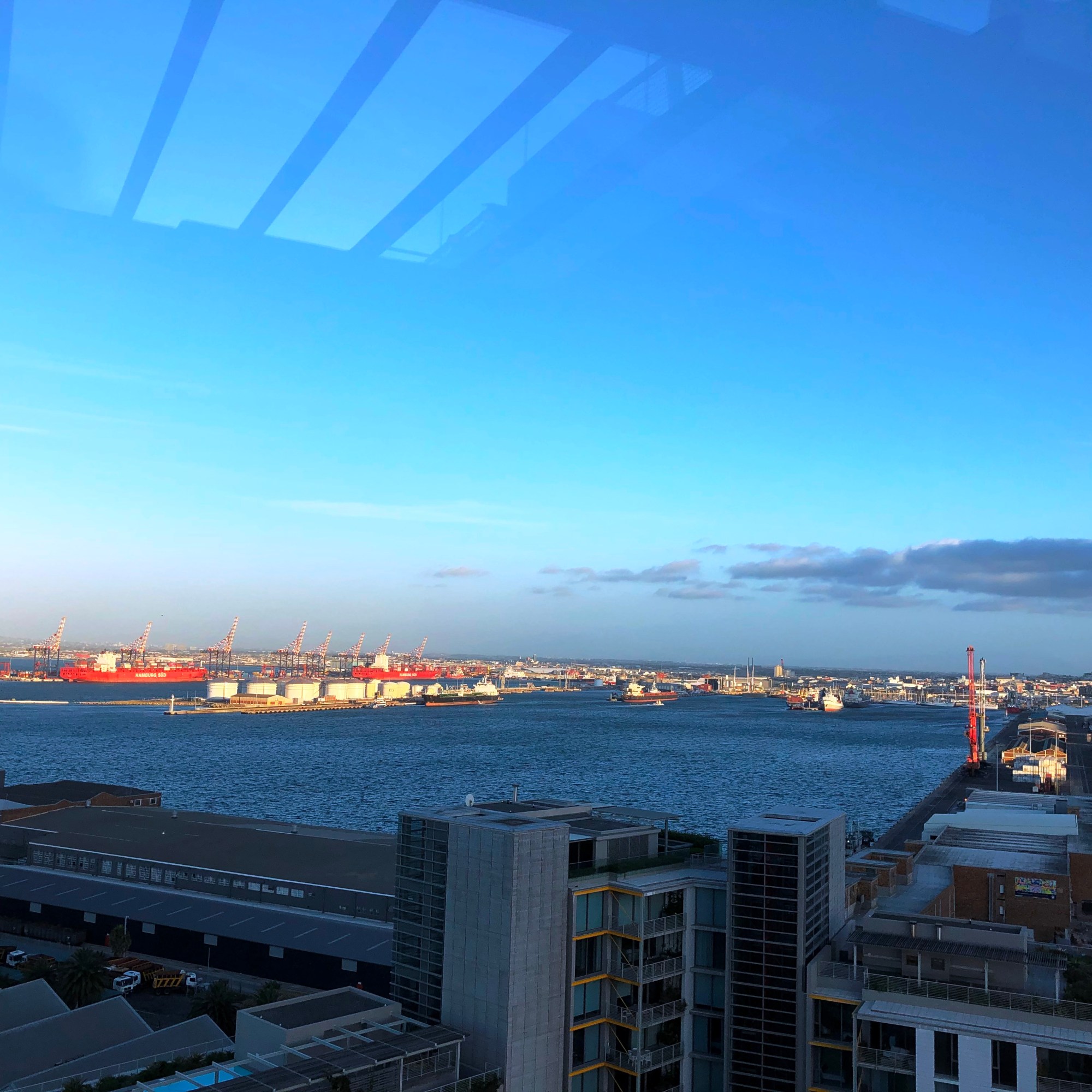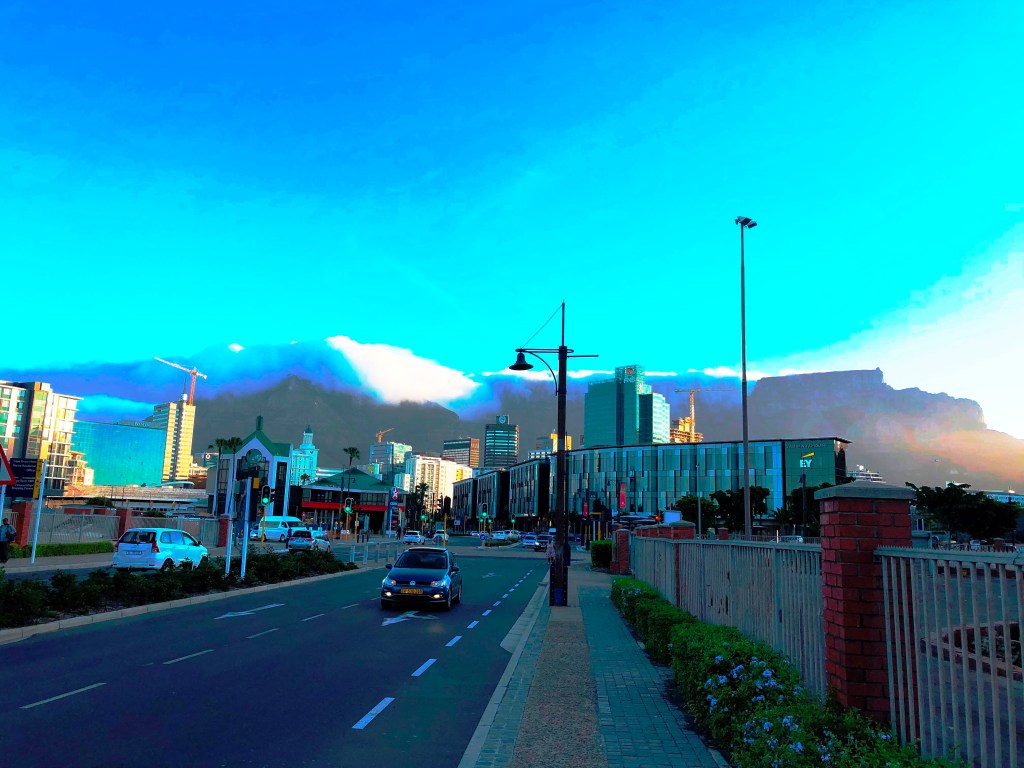 Die Strassen waren belebt und nach einer Viertelstunde waren wir an der Hafenmeile. Unterwegs konnten wir noch ein in Kapstadt bekanntes Phänomen beobachten, die sogenannte ‚Tischdecke des Tafelbergs‘. Dieses Schauspiel wurde uns so erklärt: die feuchtigkeitsbeladenen Wolken steigen auf und prallen gegen den Berg. In der Höhe erreichen die Winde die Wolken. Diese ‚rollen‘ über den Berg und fallen wie ein Wasserfall auf die Stadt hinunter. Ein tolles Schauspiel.