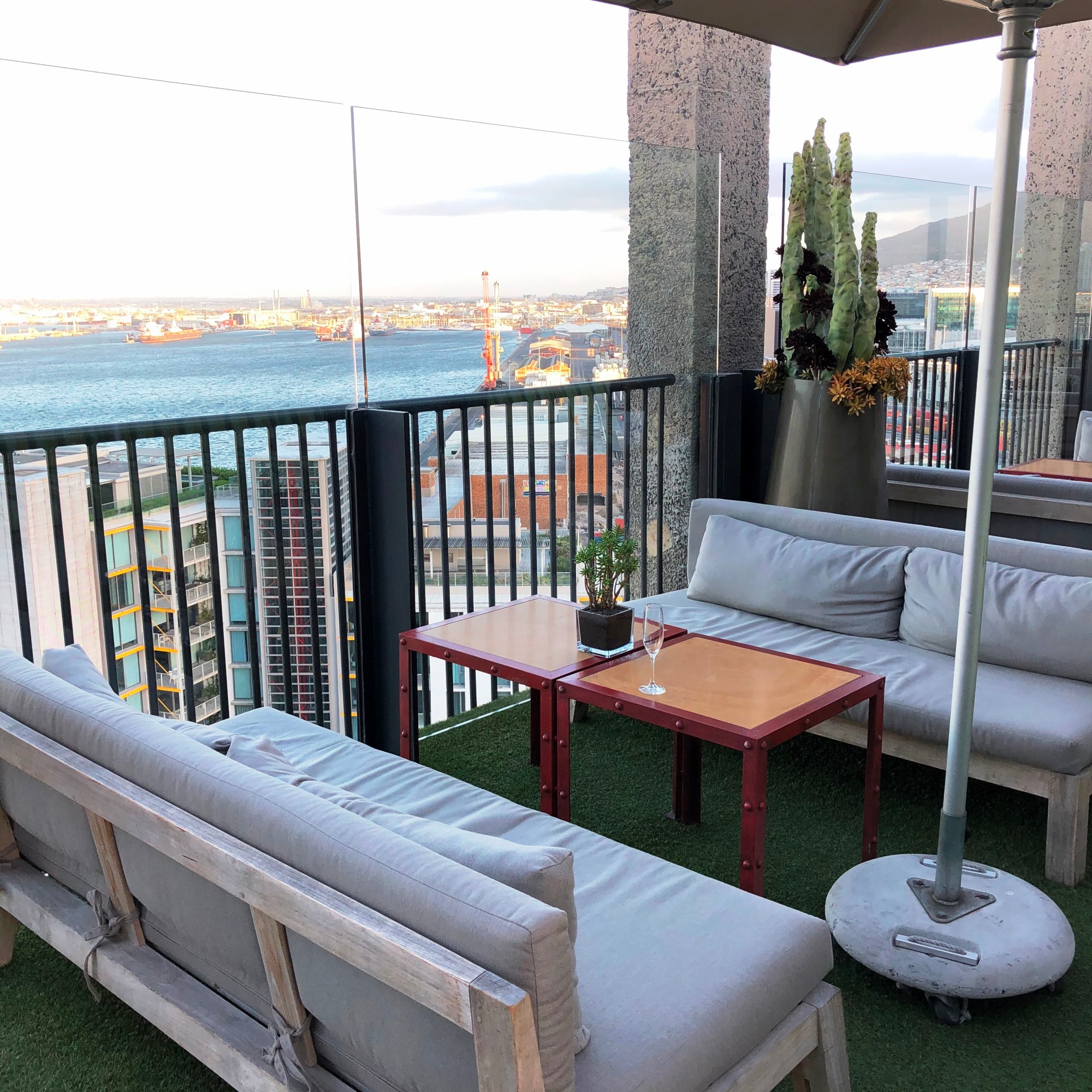 Ein Anruf in unserem Hotel ergab – gar nichts. Man würde uns zurück rufen. Zeit für eine zweite Zigarette und dann wurde uns das Warten zu blöd, wir nahmen ein Taxi. Was übrigens in Kapstadt sehr günstig ist. Nach fünfzehn oder zwanzig Minuten waren wir im Hotel. So früh am Morgen war unser Zimmer natürlich noch nicht bezugsfertig und wir schauten uns als Erstes die Dachterrasse des Hotels an, tranken einen Kaffee und genossen den ersten – wolkenverhangenen – Blick auf den Tafelberg. Ich hatte Gelegenheit, mit dem jungen Kellner über Fussball zu debattieren (im Fernsehen wurde gerade irgendein Spiel wiederholt). Bundesliga, Premier Ligue, La Liga – Spieler, Trainer und Tabellenstände rauf und runter. Wer andere Berichte von mir gelesen hat, weiss, hier war ich doch in meinem Element. Meine Freundin meinte später, ich hätte dem jungen Mann aber mächtig Eindruck gemacht. Was mir gezeigt hat, dass man auch in meinem Alter einem jungen Mann mit irgendetwas Eindruck machen kann