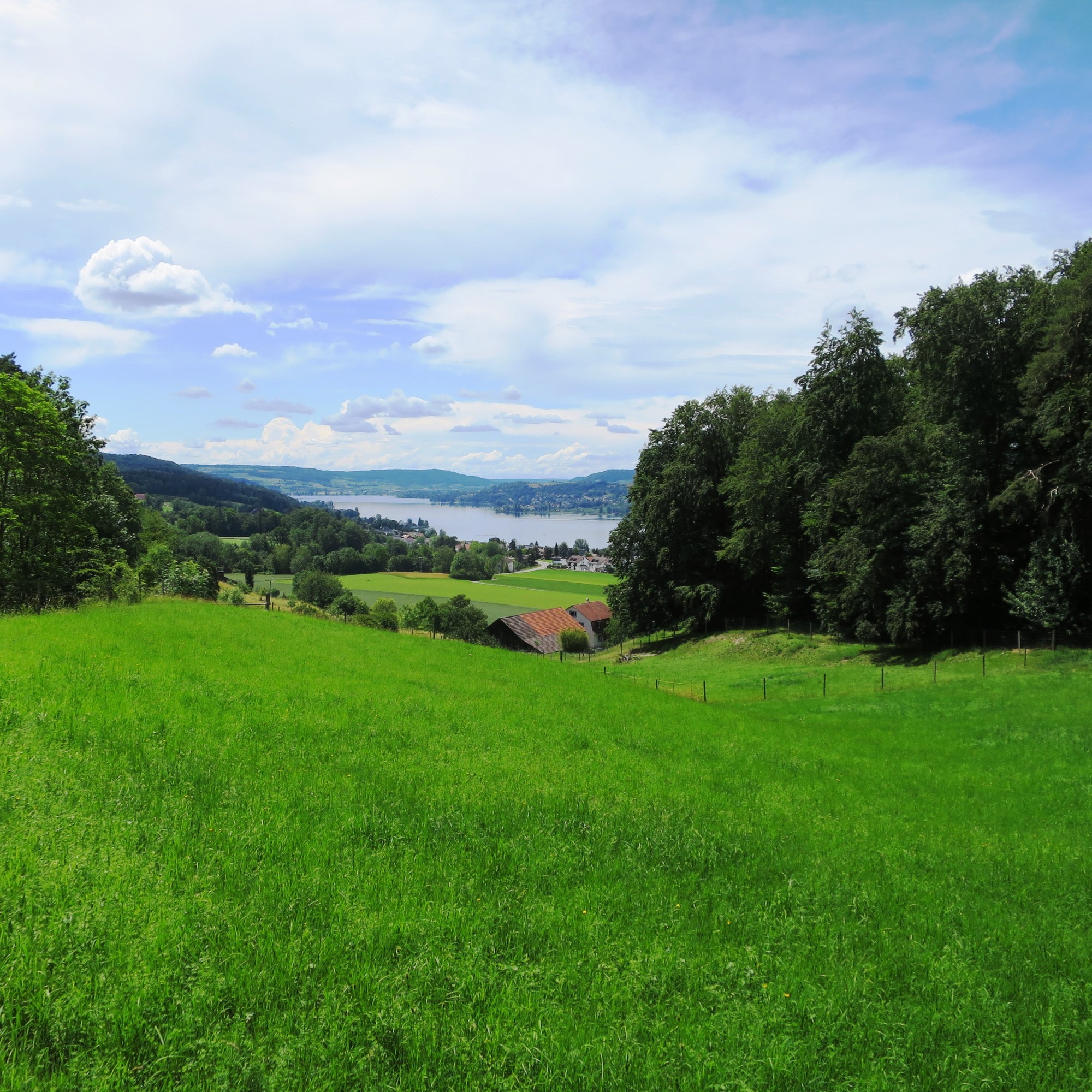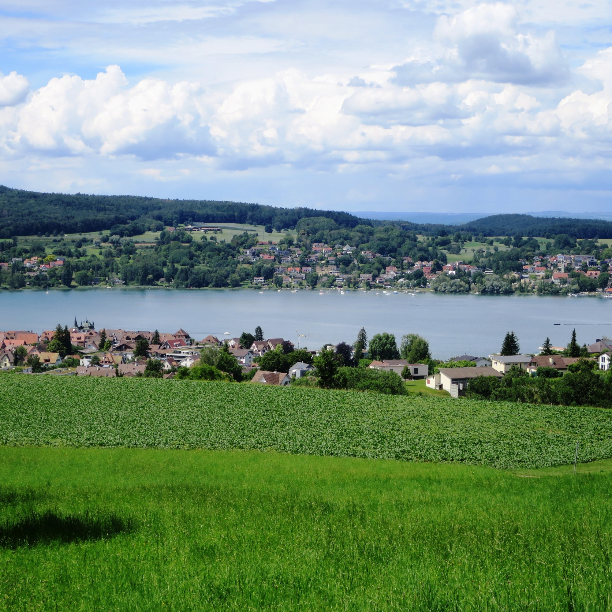 Wenn man wieder aus dem Wald kommt, sieht man in der Ferne den Untersee. Anschliessend stösst man auf einen breiten Feldweg und wird mit dem Blick hinunter nach Steckborn und auf den Bodensee belohnt.