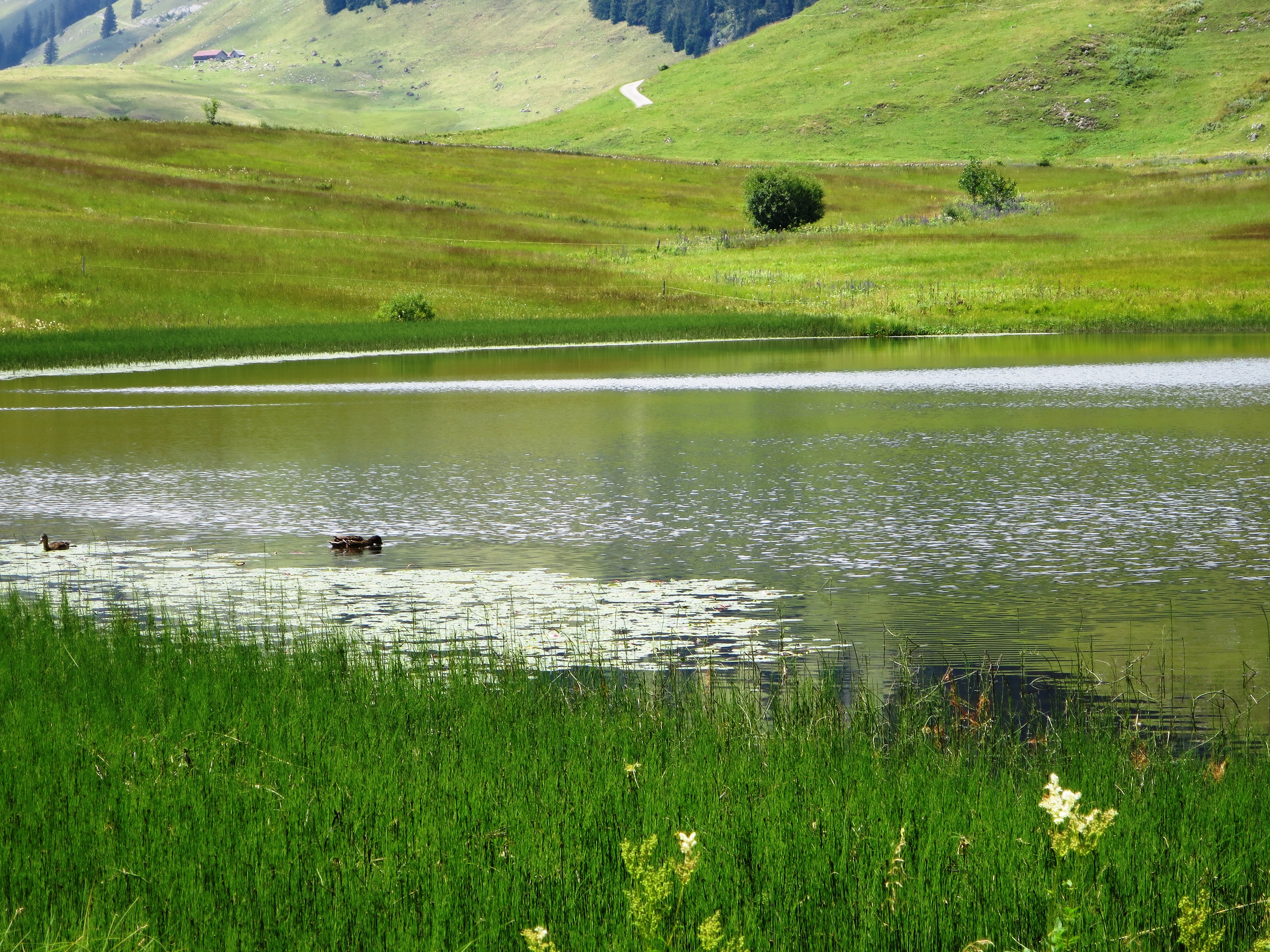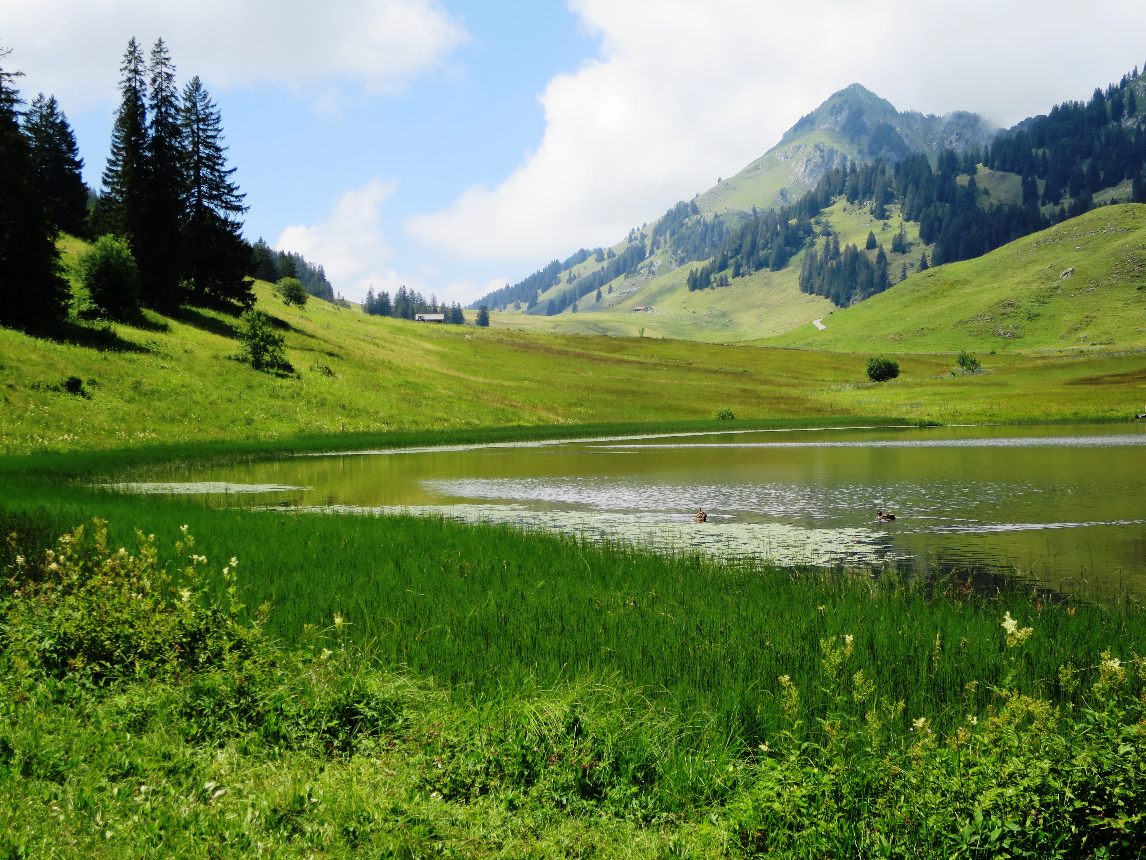 Zurück zur Weggabelung führt der Weg weiter Richtung Gräppelensee. Ist man erst einmal durch den Wald, hat man den Säntis im Blick. An der Weggabelung Chüeboden biegt man nach links ab und man läuft ca. 15 Minuten auf einer geteerten Strasse bis zum nächsten Wegweiser. Über wunderbare Alpwiesen geht es (ziemlich streng) bergauf. Auch das nächste Waldstück hat es in sich. Auf dem Talboden angekommen, ist es nicht mehr weit zum Gräppelensee. Die Kulisse ringsum ist traumhaft. Zwei oder drei Feuerstellen mit bereitgestelltem Holz bieten die Möglichkeit zum grillieren. Es kann sogar gebadet werden.