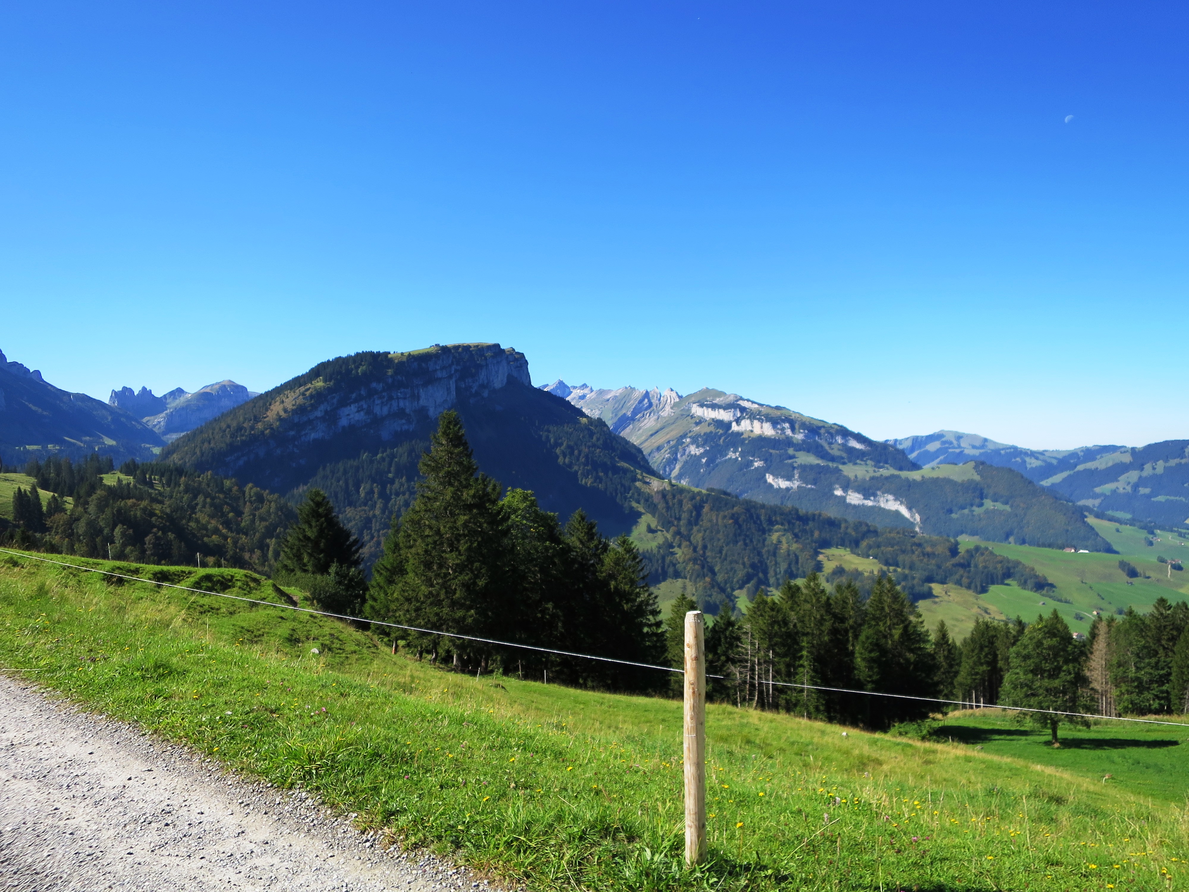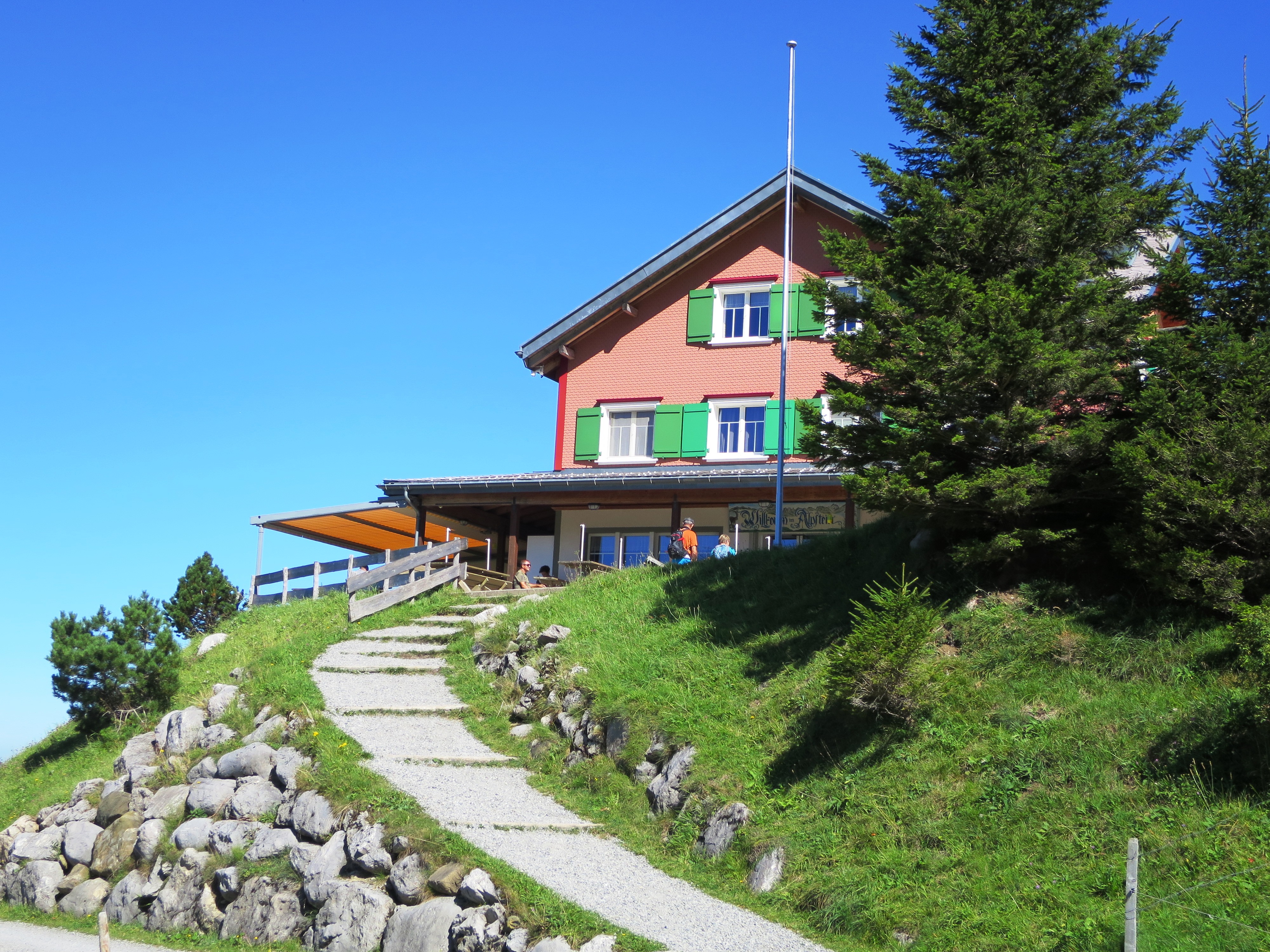 Nach einer guten halben Stunde über Fahrwege und Wiesen erreicht man das Berggasthaus Ruhesitz mit einer schönen Terrasse und Blick auf Säntis, Kronberg, Kamor und Hohen Kasten. Aufgepasst: das Gasthaus hat Mittwoch Ruhetag! Allerdings hat man die Möglichkeit, auf der Terrasse sein mitgebrachtes Vesper einzunehmen und ein Kühlschrank mit Getränken ist ebenfalls vorhanden.